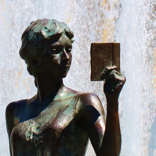 "La liseuse" (bronze) est une commande de la ville de Gap au sculpteur Cyril De la Patellière. "Une maquette en plâtre sur terre glaise, un agrandissement et travail sur modèle durant huit mois, un premier moulage en résine, envoyé à la fonderie de Carrare en Italie, puis coulage et travail du bronze durant sept mois", pour une pièce unique en bronze à patine verte (hauteur 1,55 m, largeur 0,70 m, profondeur 1 m) "assise" sur la margelle de la fontaine à jeux d'eau de la place Alsace-Lorraine. Dans cette oeuvre de fiction, elle "lit" l'histoire de la ville de Gap (un ouvrage publié sous les auspices de la Société d'études des Hautes-Alpes).