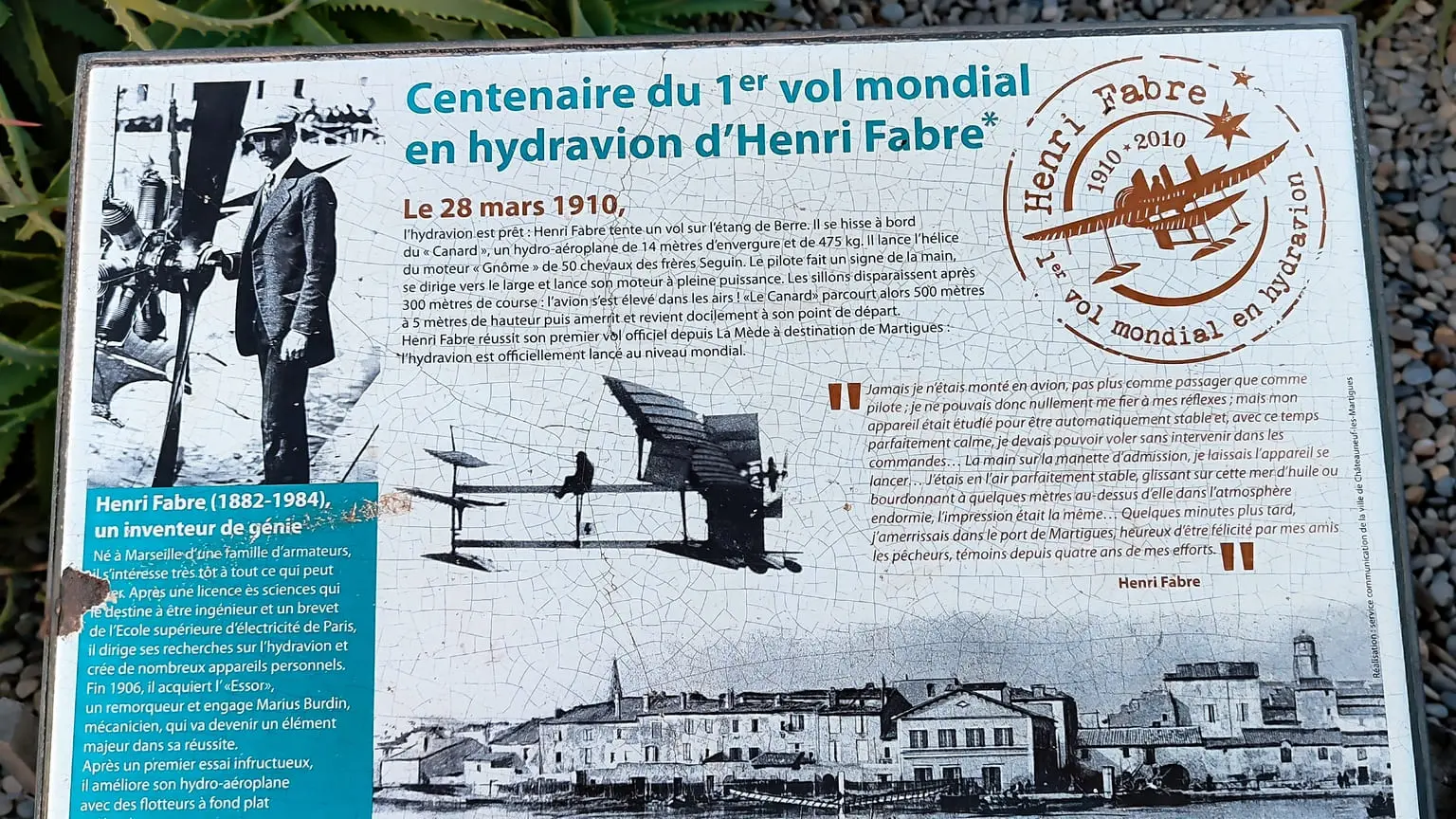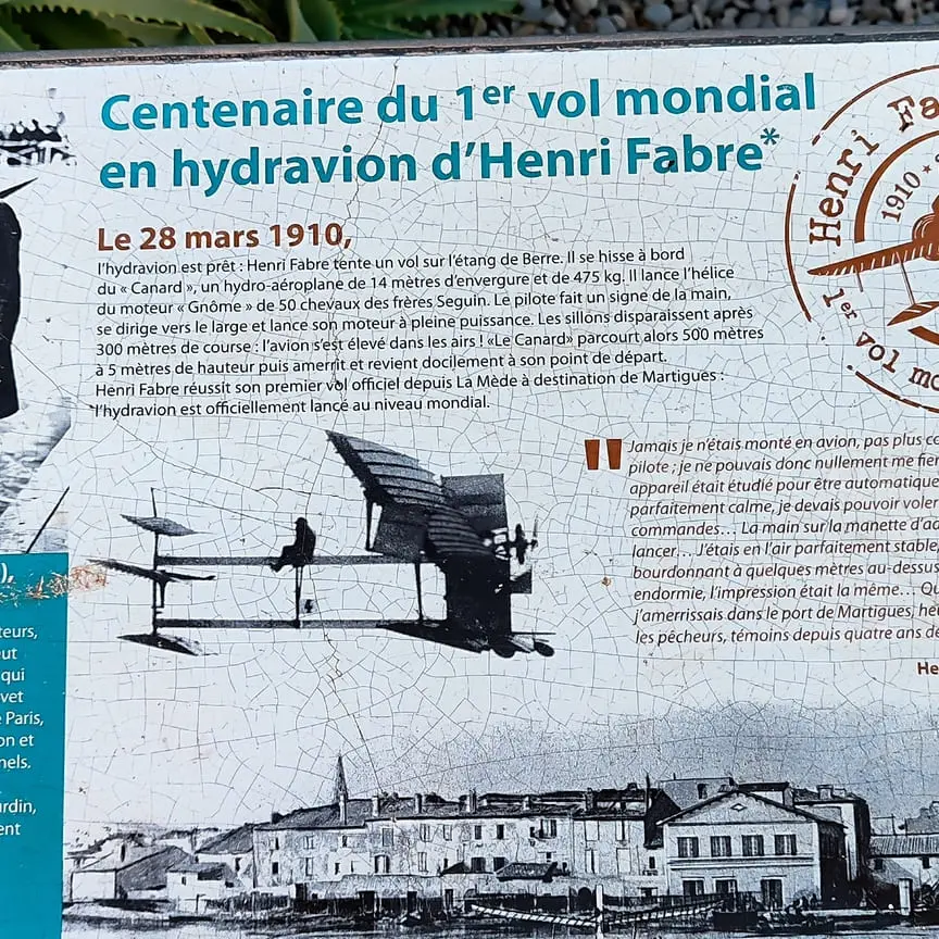 Le 28 mars 1910, Henri Fabre tente un vol sur l'étang de Berre. Il se hisse à bord du "canard", un hydro-aéroplane de 14 mètres d'envergure et de 475 kg. Il lance l'hélice du moteur "Gnôme" de 50 chevaux des frères Seguin. Le pilote fait un signe de la main, se dirige vers le large et lance son moteur à pleine puissance. Les sillons disparaissent après 300 mètres de course : l'avion s'est élevé dans les airs !