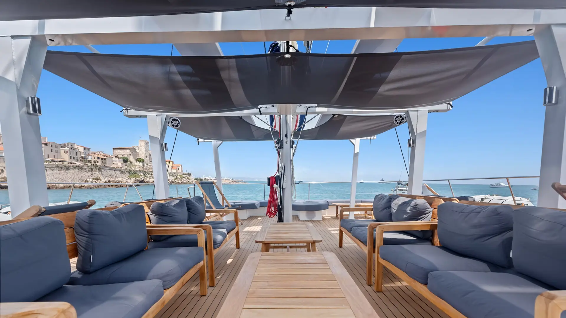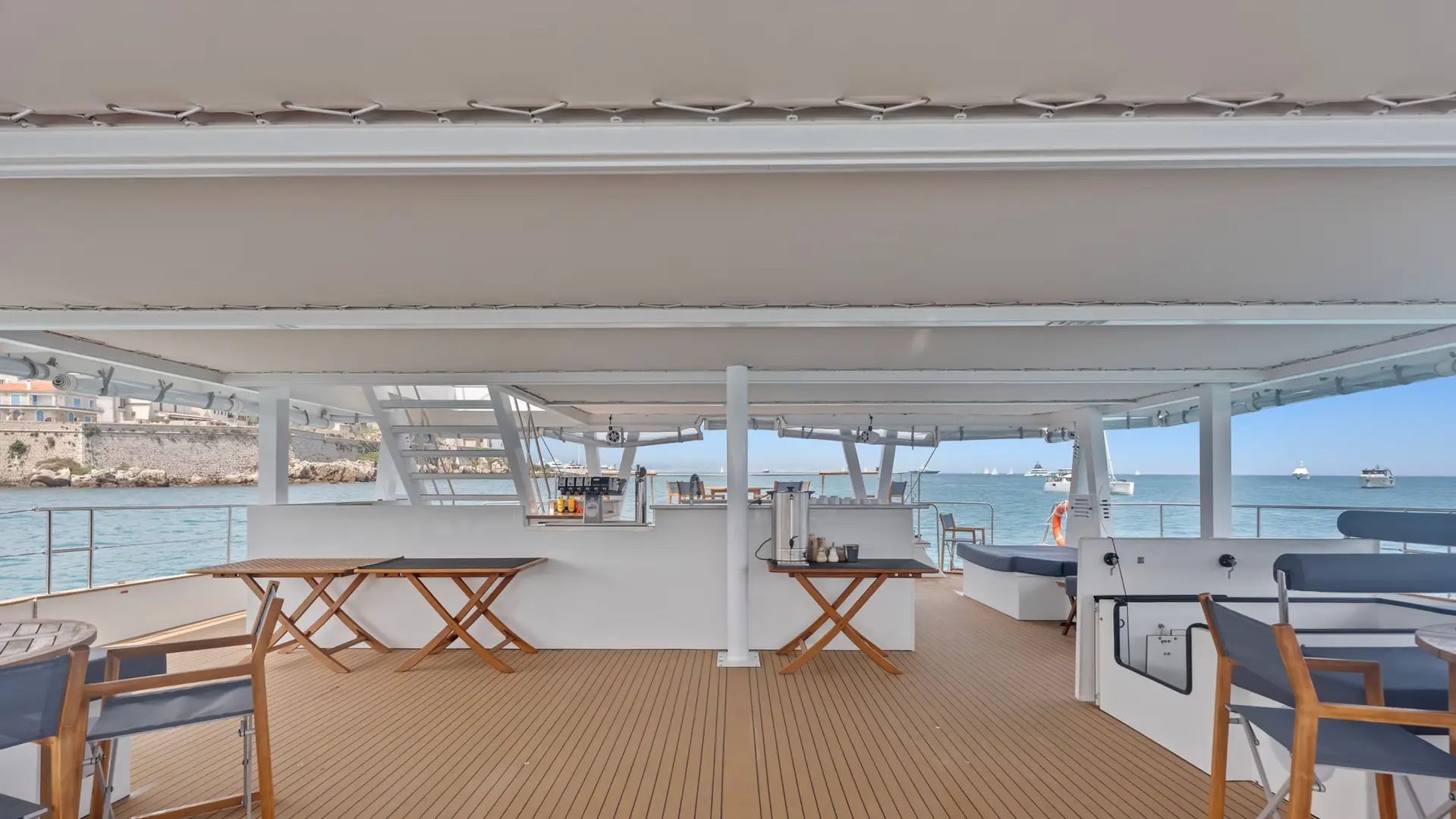 Croisières collectives et privatisées en maxi catamaran aux départs de Port Marina et Port de Nice - Sorties côtières à bord du MayBa, catamaran premium de 20 m de long sous Pavillon Français au design lounge sur 2niveaux - Capacité 200 personnes.