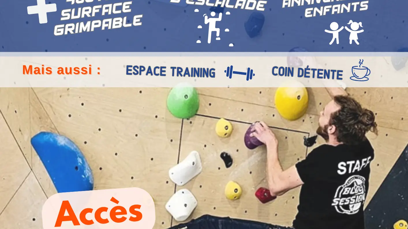Nous vous accueillons dans une structure récente offrant 450m2 d'espace dédié à l'escalade, 100 blocs de tous niveaux, 10 profils différents et de nombreux volumes.