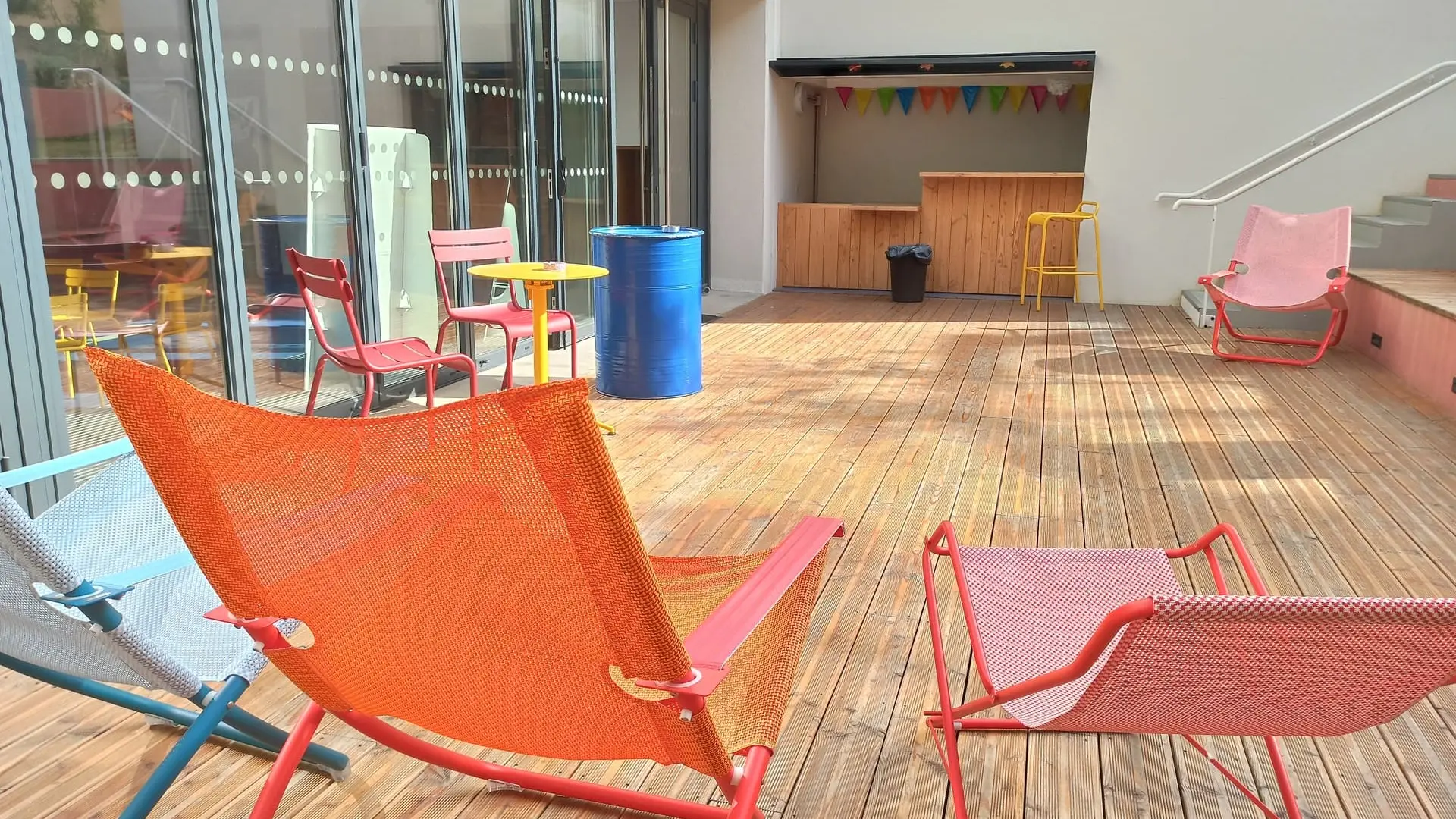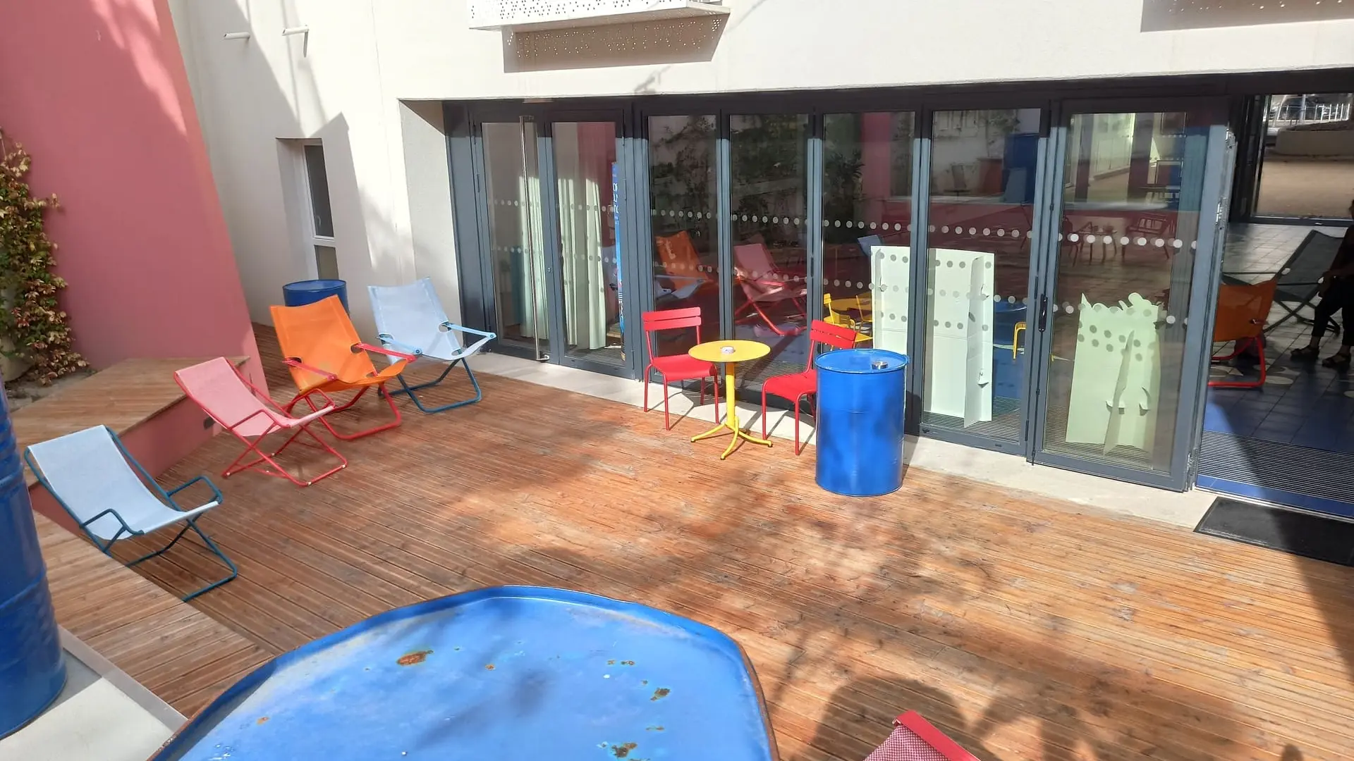 Le hall d'accueil du cinéma est ouvert à tous ainsi que sa cour intérieur et son jardin. Vous y trouverez notamment un distributeur automatique de boissons, des poufs et toilettes.