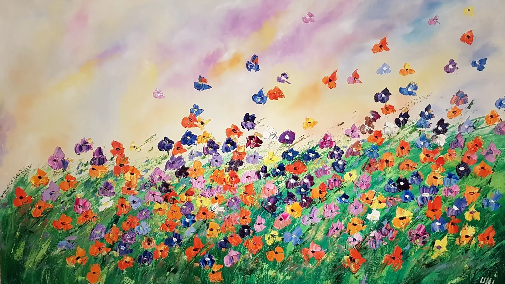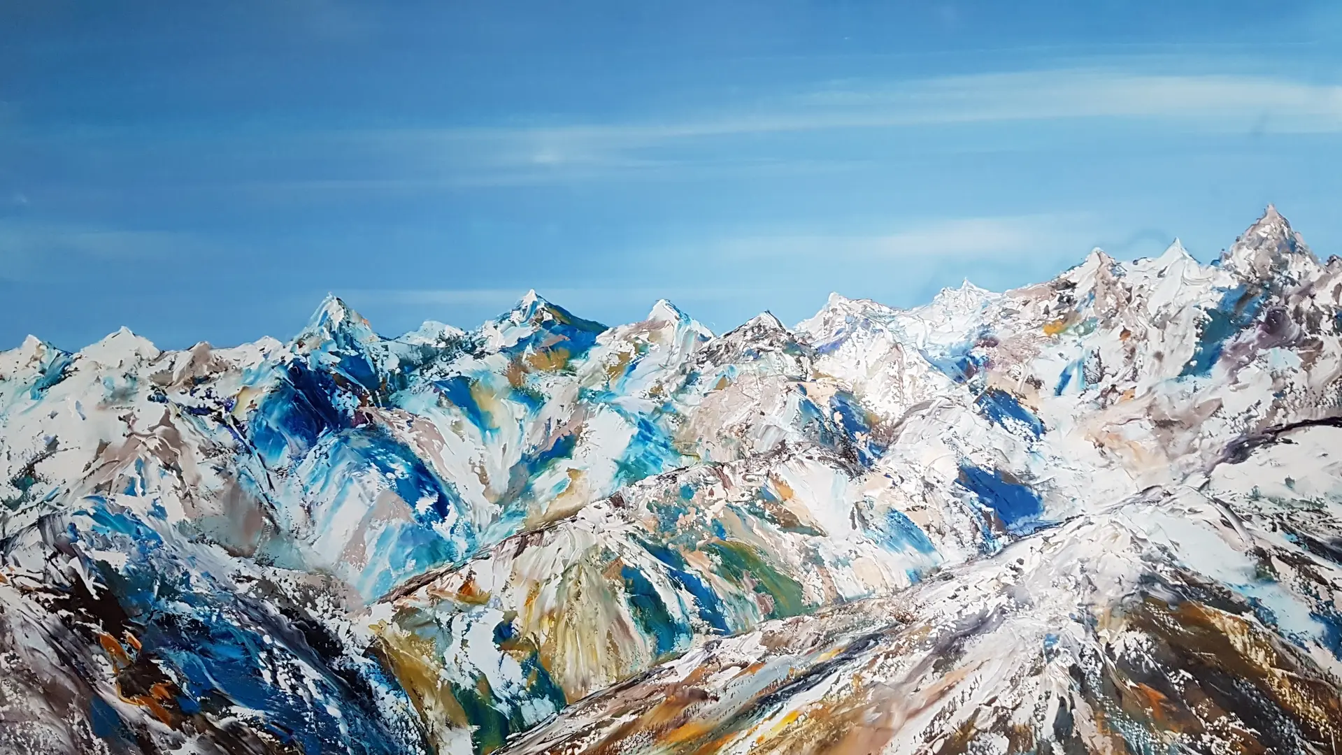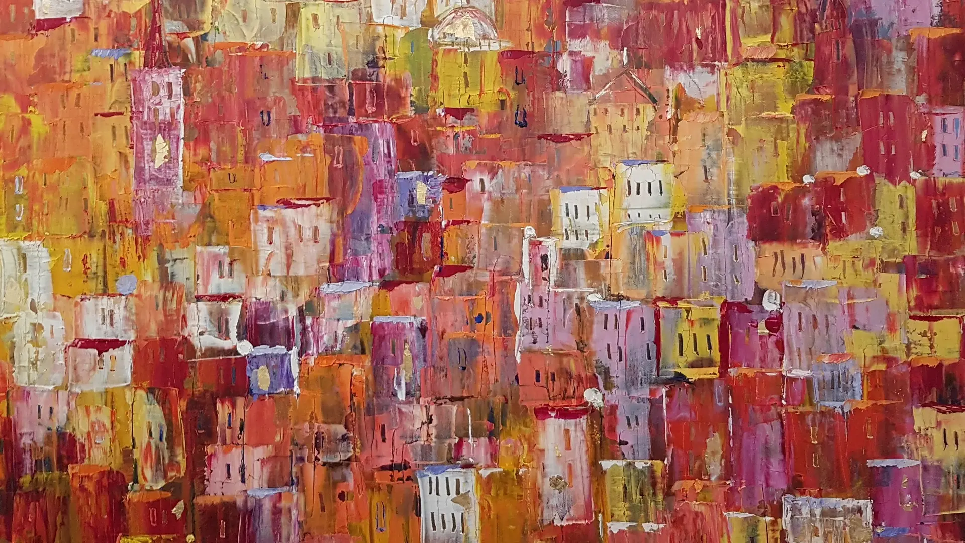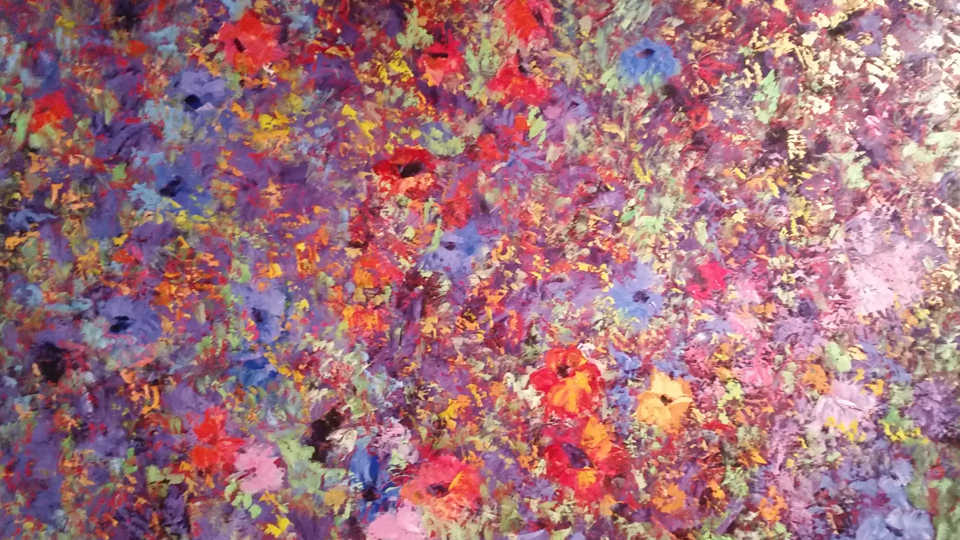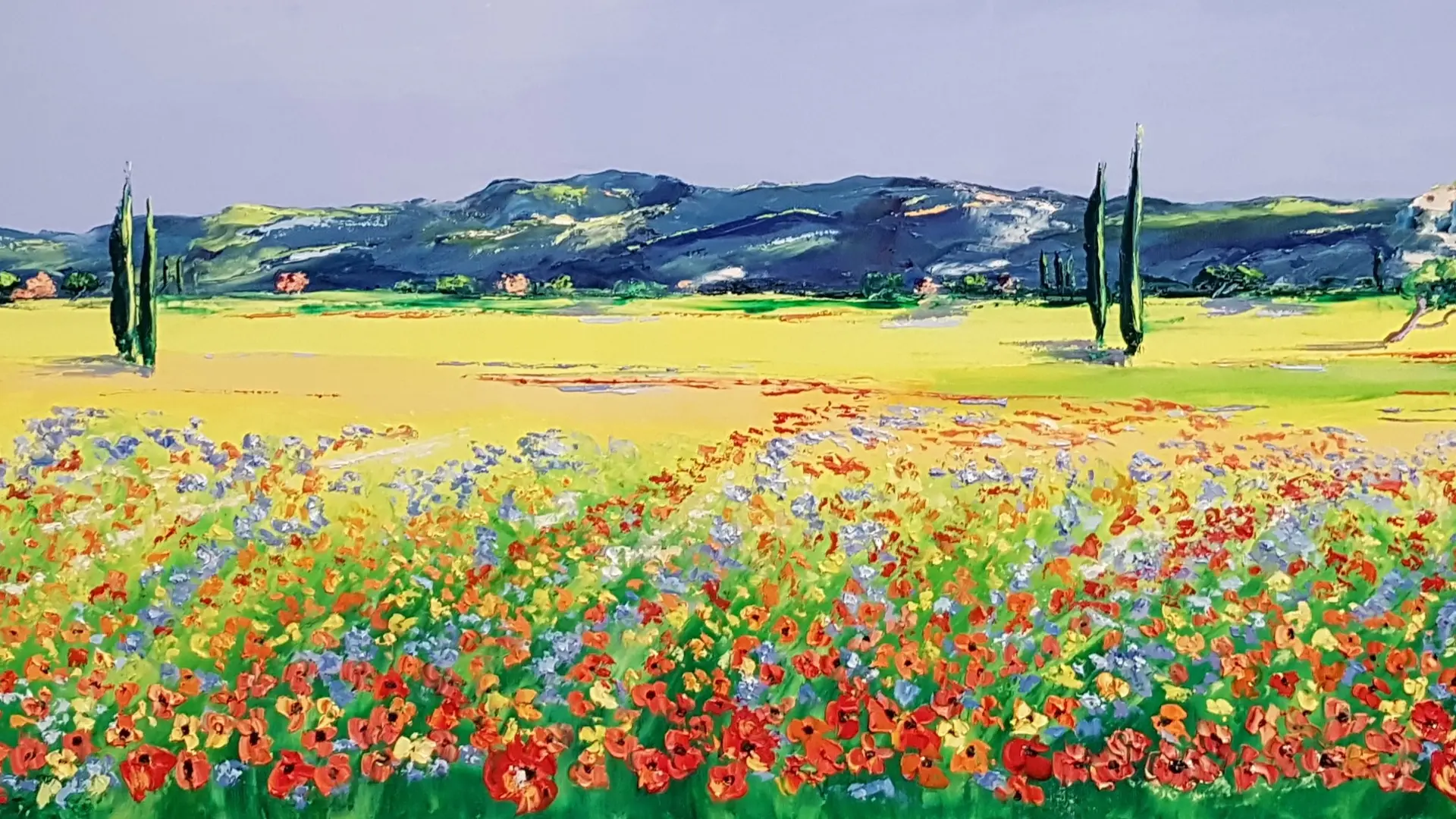 Sur la toile, les couleurs se transforment en lumière, en chaleur et en mouvement. La chaude luminosité du Sud éclatante rentre alchimie avec les couleurs. Les mains, les couteaux, les pigments les subliment à leur tour sur les toiles.