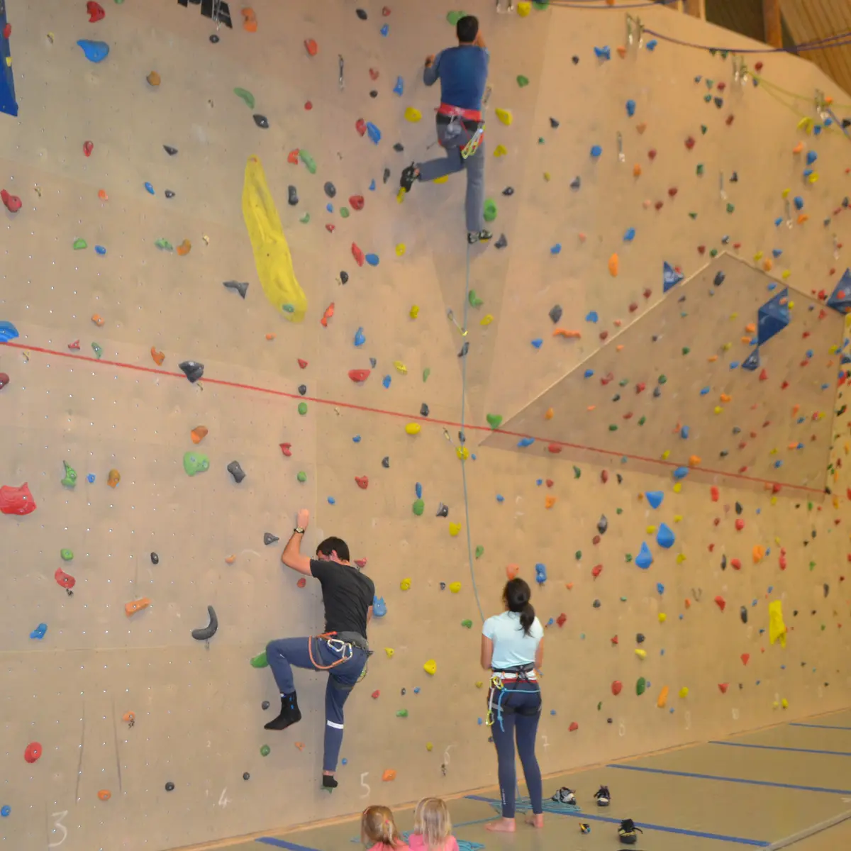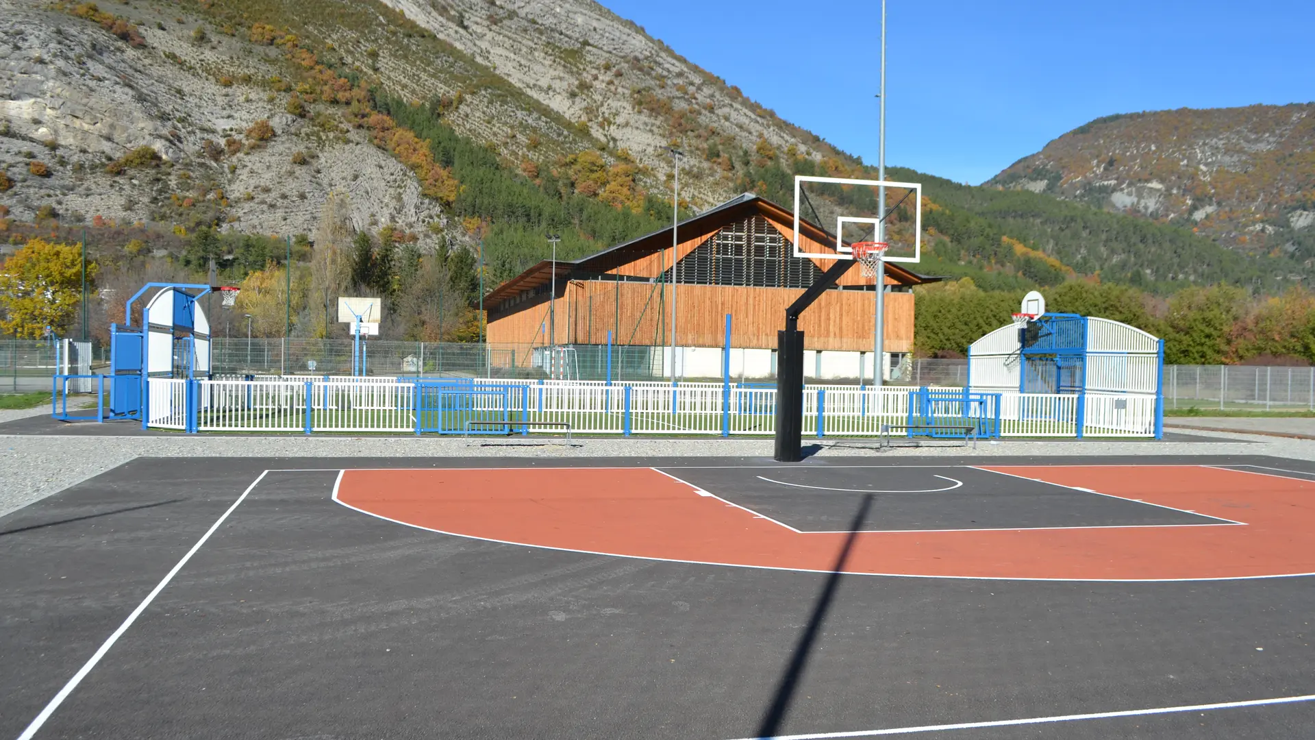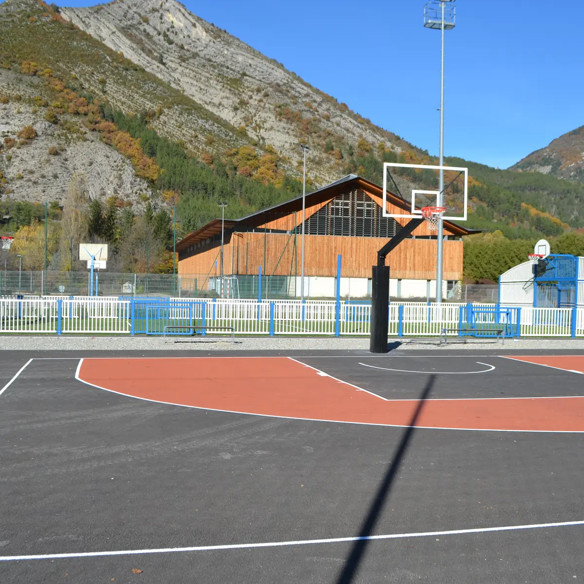 Structure équipée d’un terrain de basket, terrain de hand et de futsal, mur d’escalade de 7 mètres avec voies équipées.