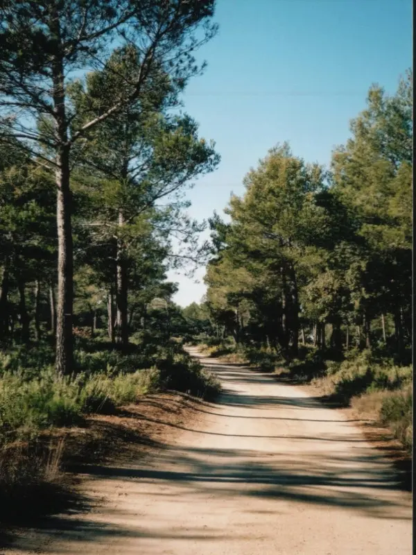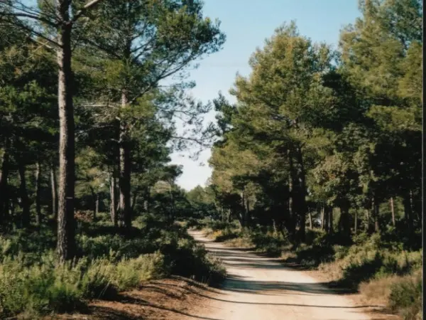 Après avoir longé de part et d'autre des oliveraies, prendre à droite, perpendiculairement à la route, un chemin goudronné qui entame un raidillon jusqu'à une bâtisse en ruine. Suivre le chemin bordé de pins et de chênes qui redescend entre des oliveraies.