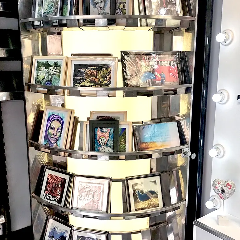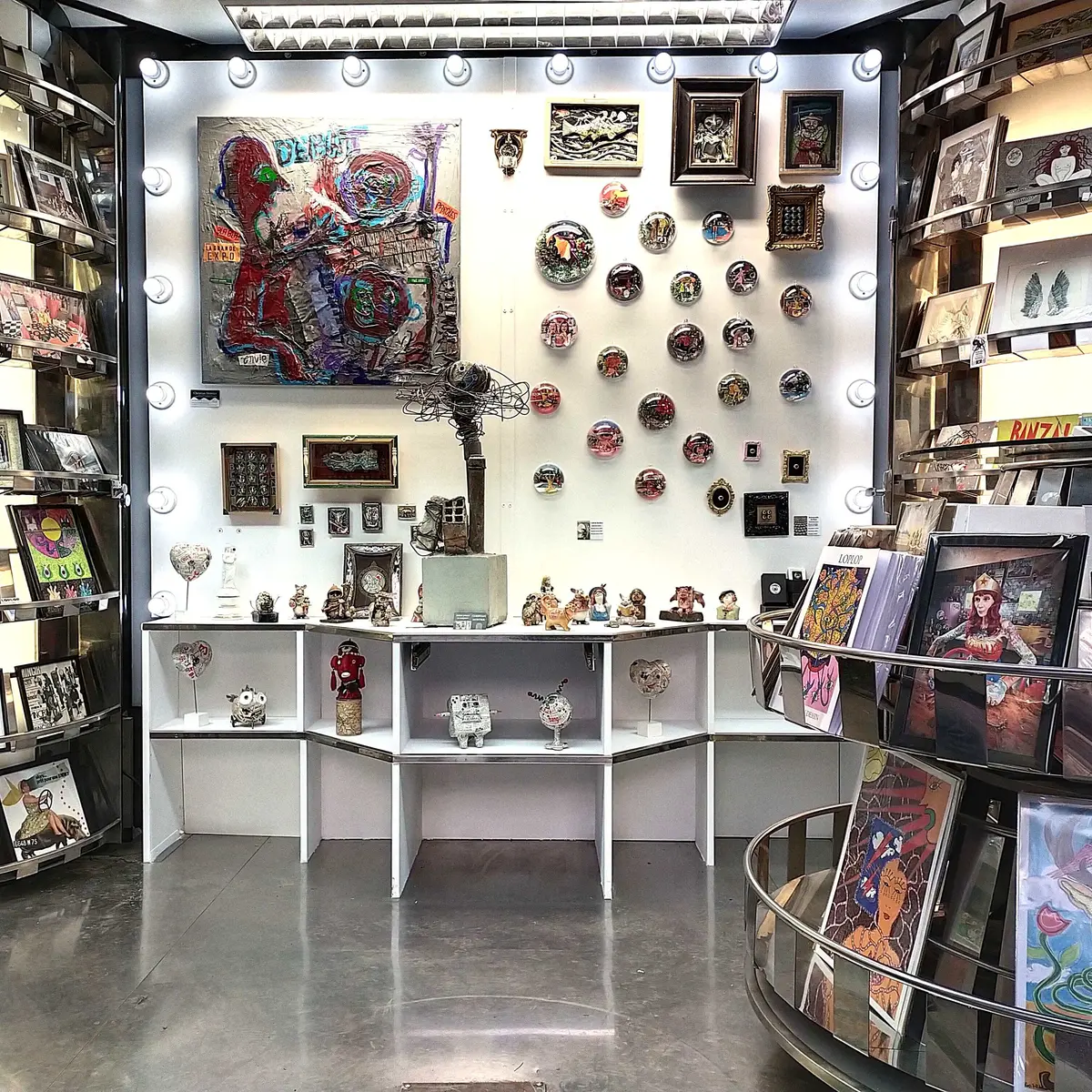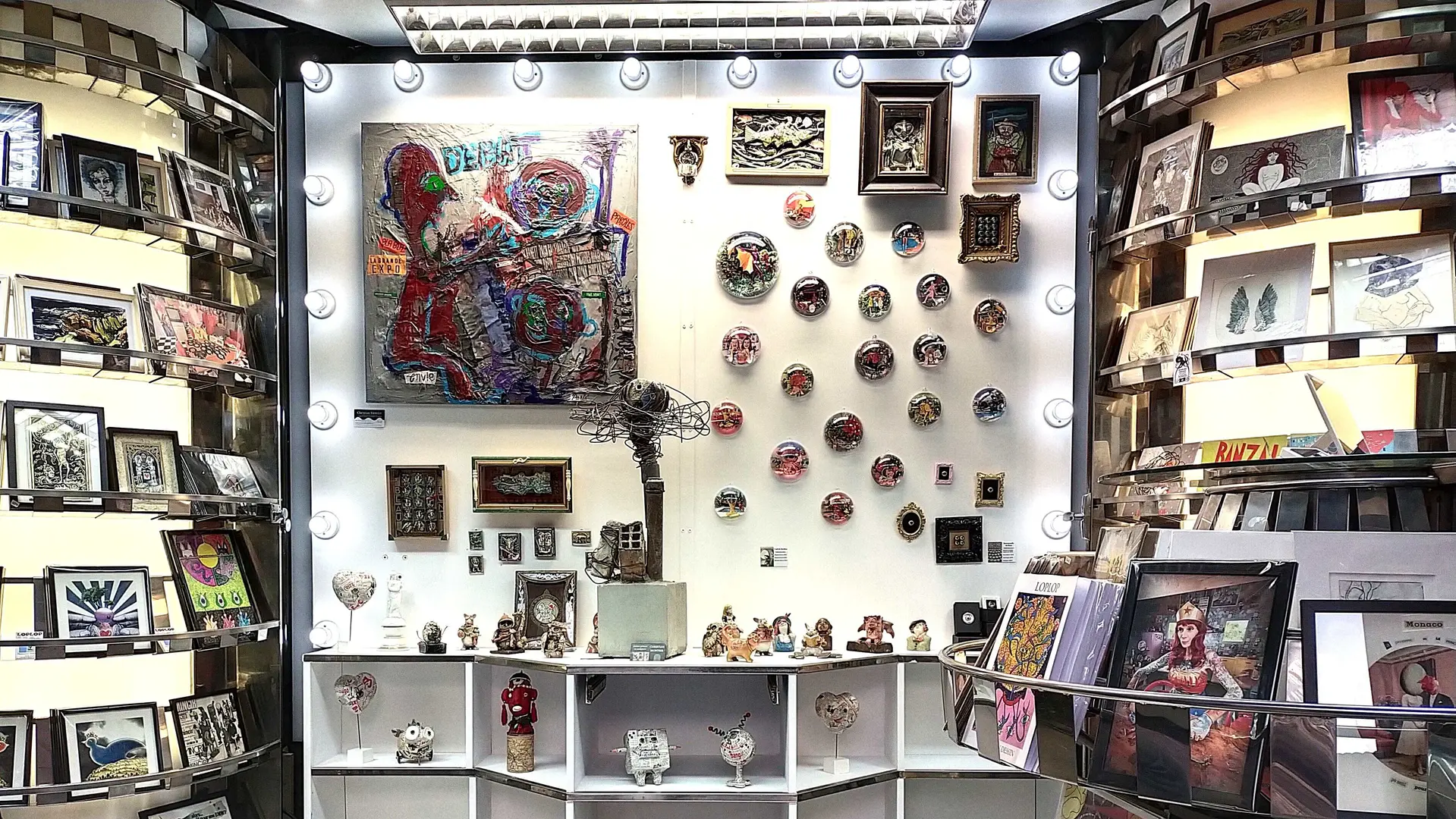 Plus de 300 œuvres uniques ou de petites séries (dessin, gravure, collage, photo, sculpture, etc.) sont réunies dans 11 m². De l'art accessible, à la portée de toutes les bourses, dans l'une des plus petites galeries au monde.