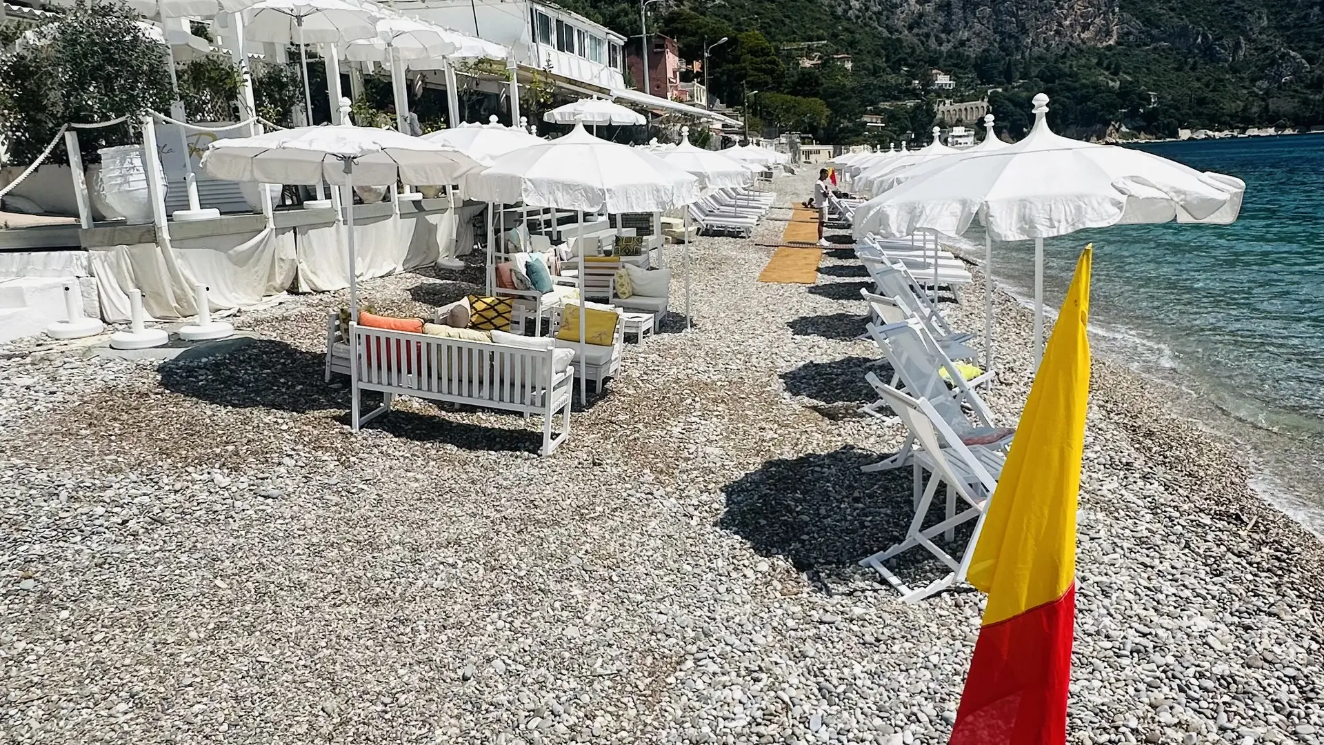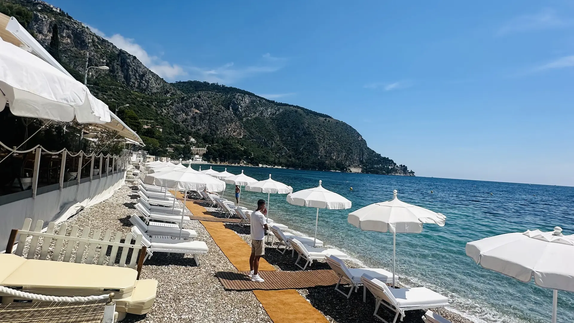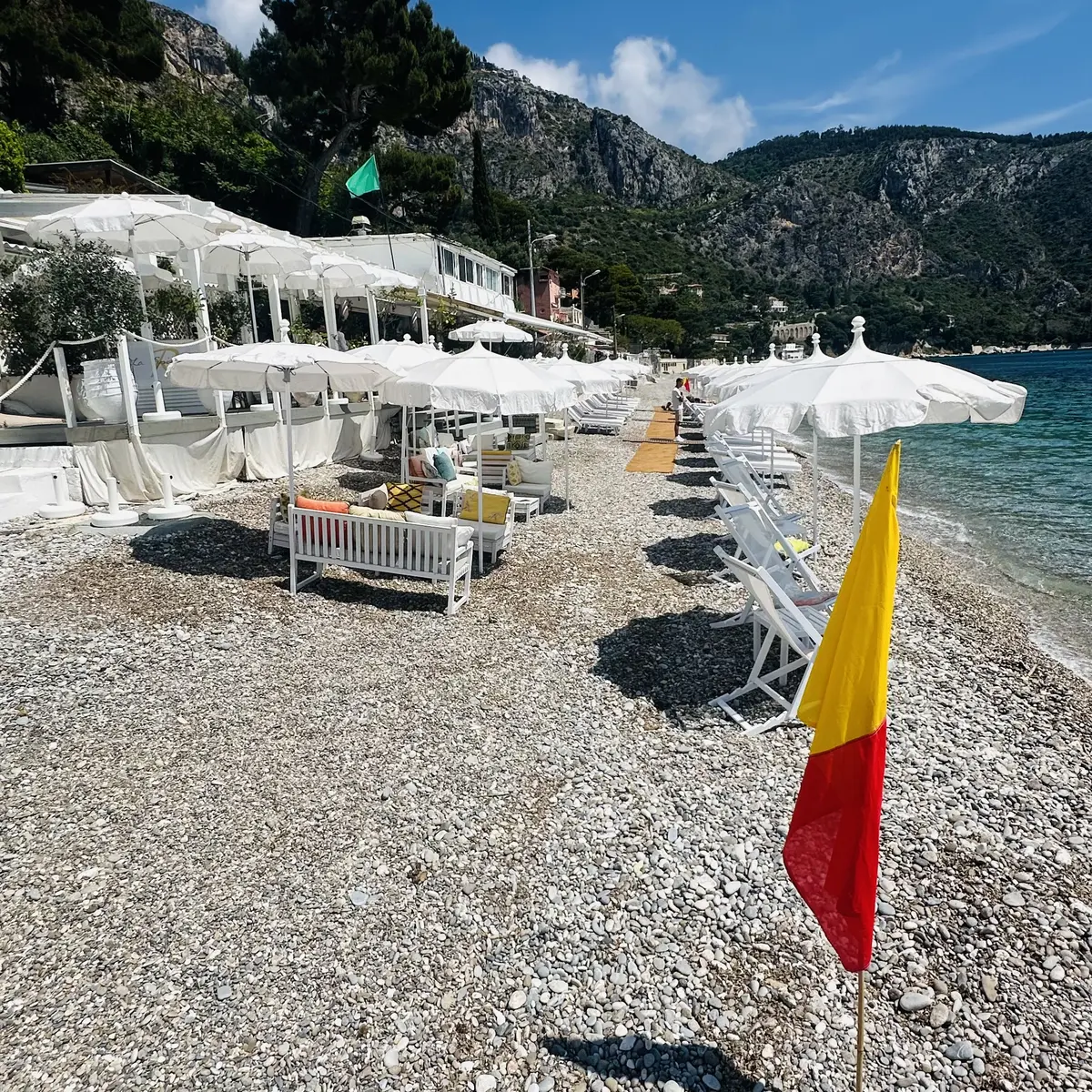 le cadre idyllique de la plage d’Eze avec La Spiaggia, un restaurant de plage au bord de l’eau.