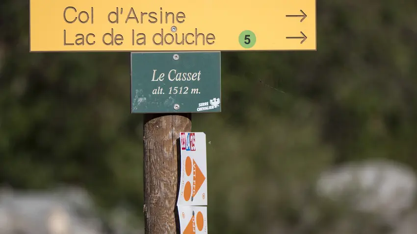 Traverser le village du Casset, après le deuxième pont, emprunter le chemin goudronné puis suivre le balisage rouge et blanc (GR 54).