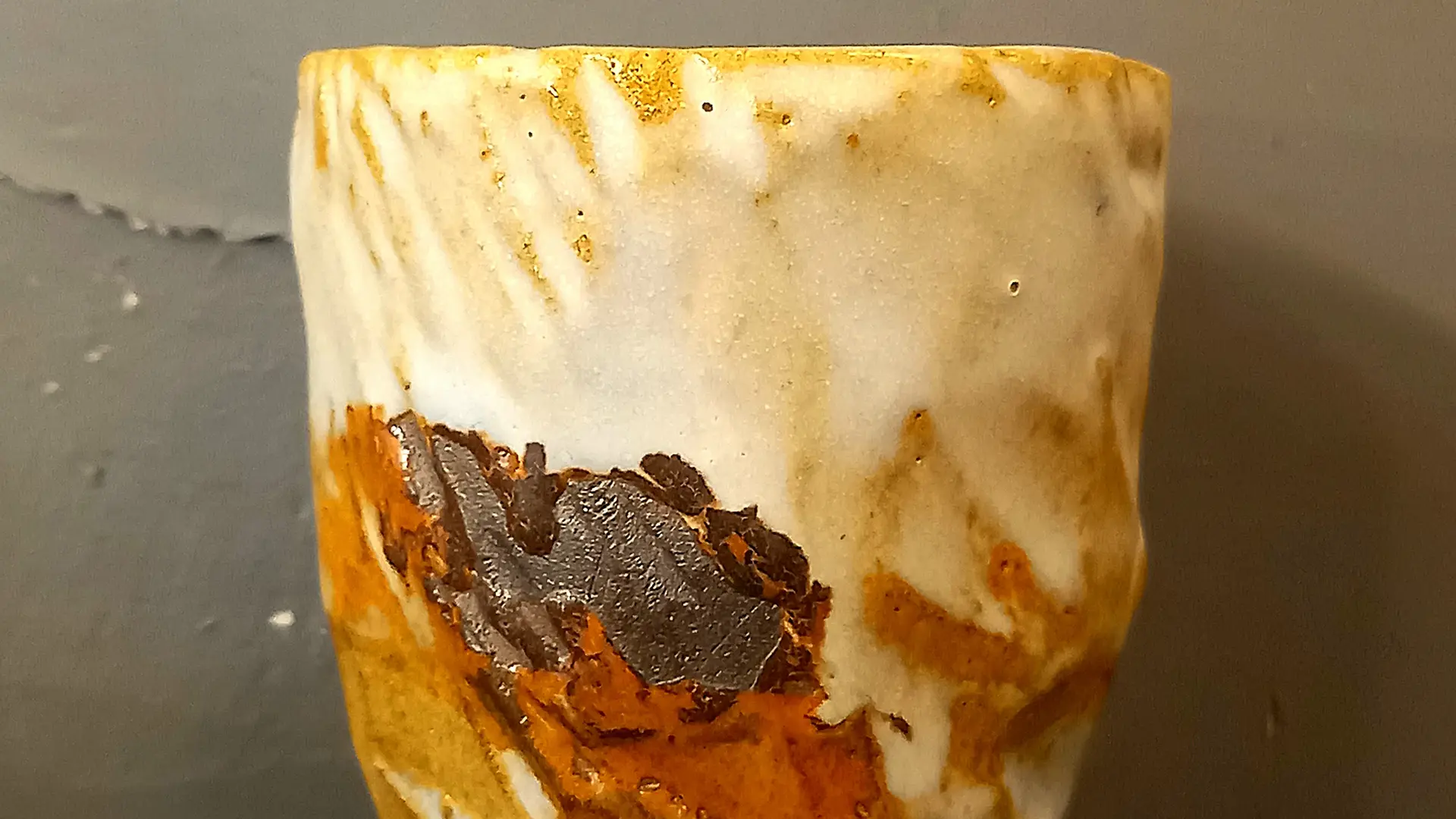 Ces poteries en grés tournées puis sculptées évoquent la terre originelle, la roche, la nature. Elle emploie l'émail comme un peintre ce qui crée des paysages abstraits.