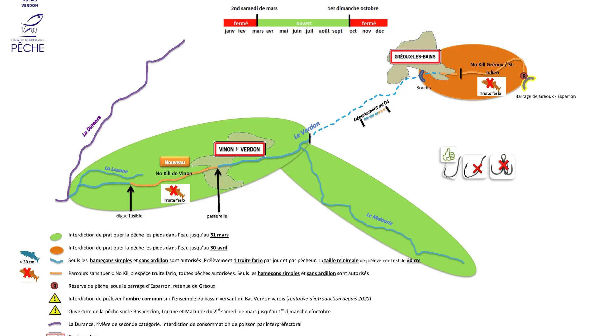 Nombre de prises : Réduit de dix truites par jour à une seule truite fario depuis 2023, validé par arrêté préfectoral.