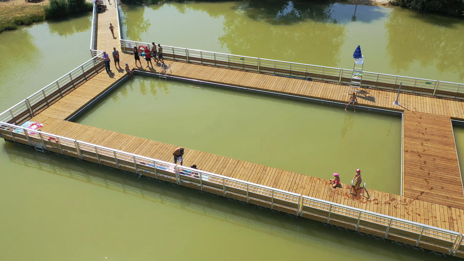 > Accès libre : deux piscines flottantes d'un volume de 230 m² cumulées, entourées de plages en bois, ont été installée au large des berges naturelles et reliée par deux pontons flottants en liaison avec les espaces ludiques. Deux zones de baignade ont été créées : un grand bassin de 160 m2 et 1,40m de profondeur et un petit bassin de 70 m² et 40 cm de profondeur.