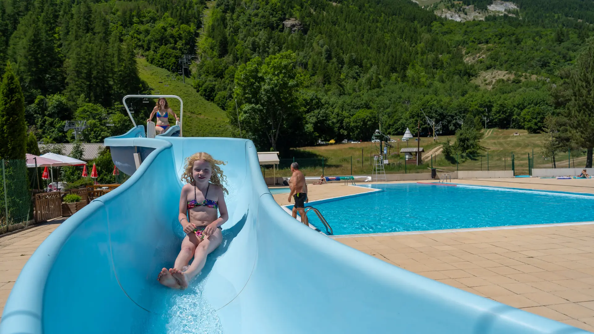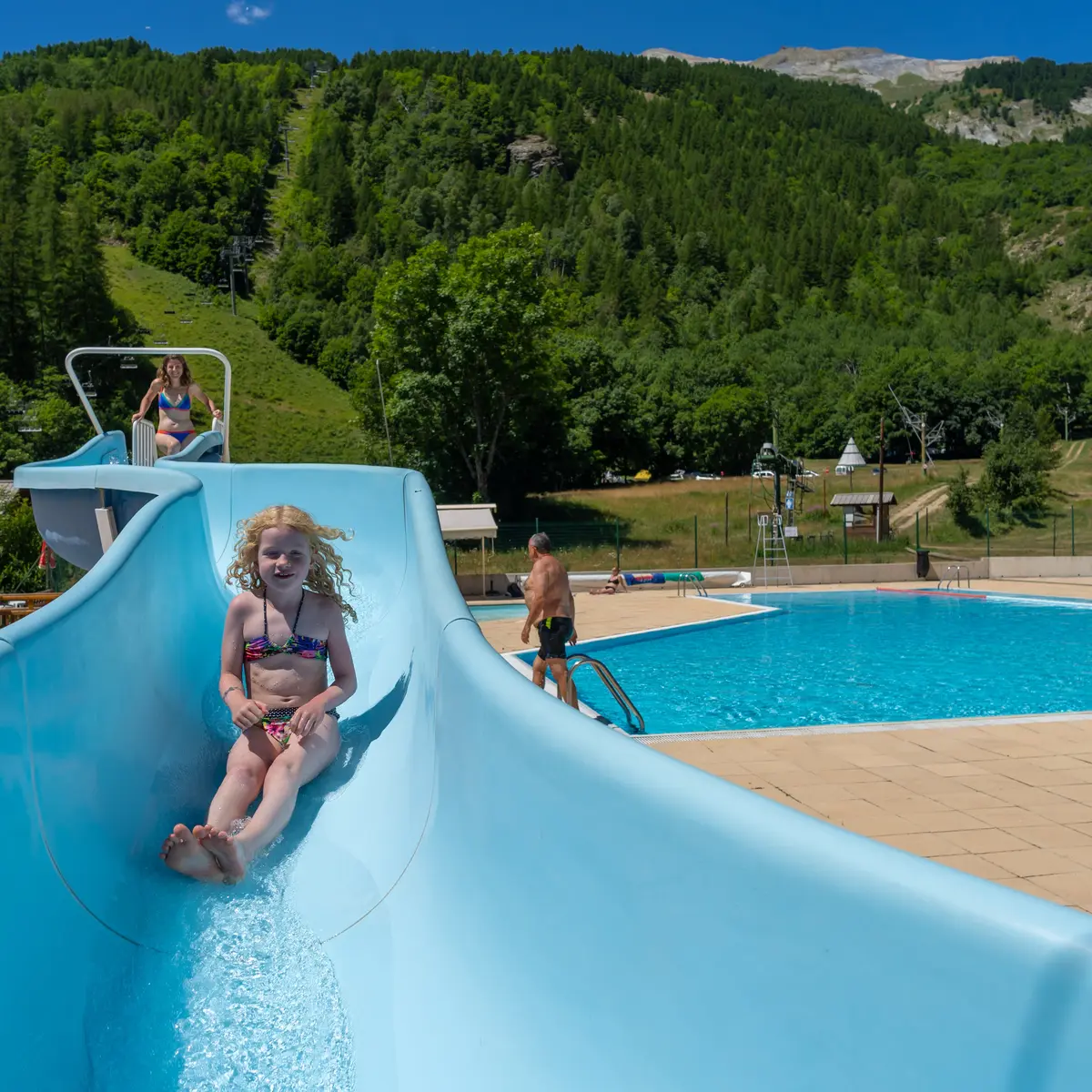 Bassin pour les enfants, un toboggan, chauffage solaire.