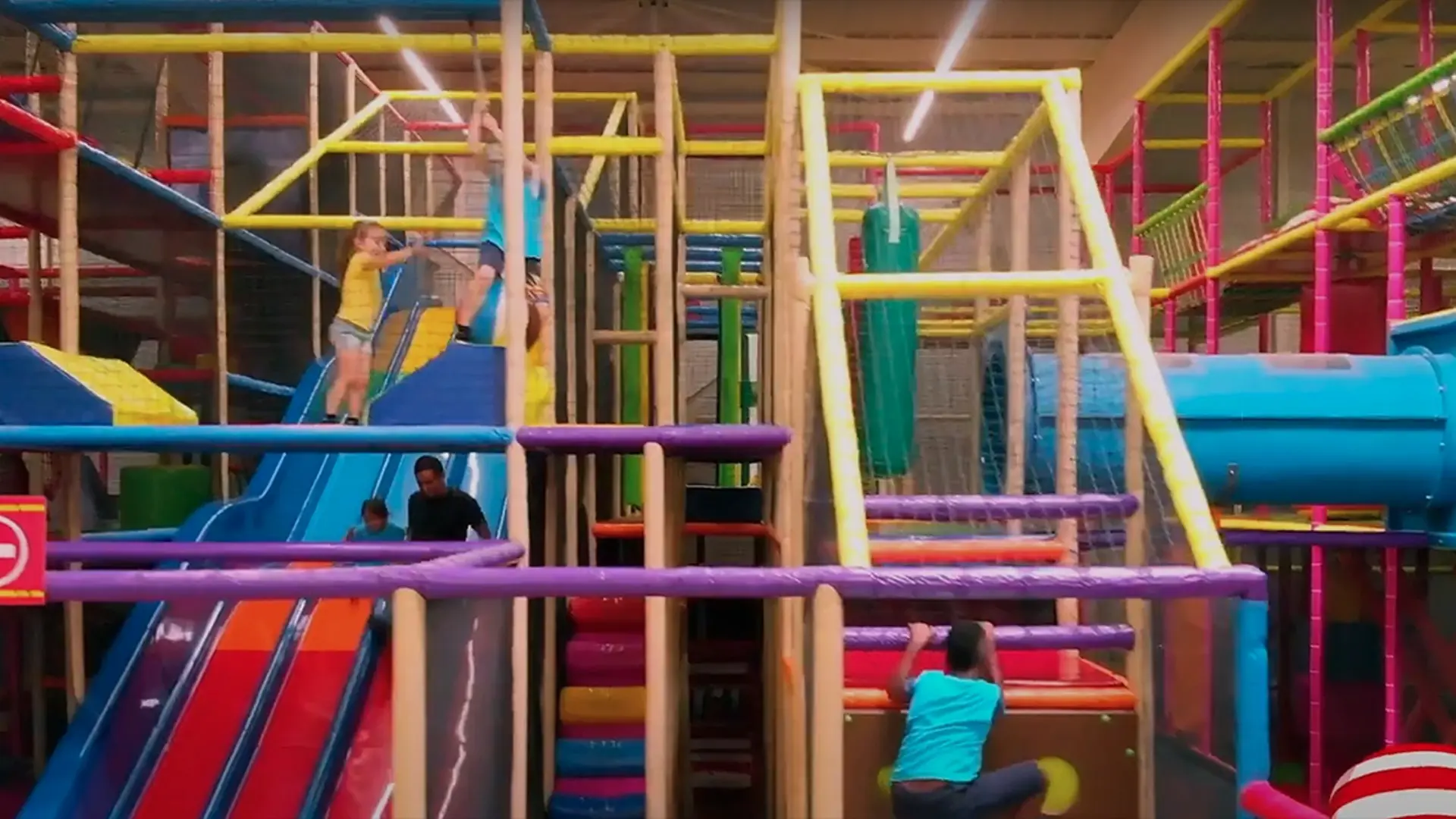 Un espace parcours d'éveil et de motricité avec toboggans et piscine à balles.