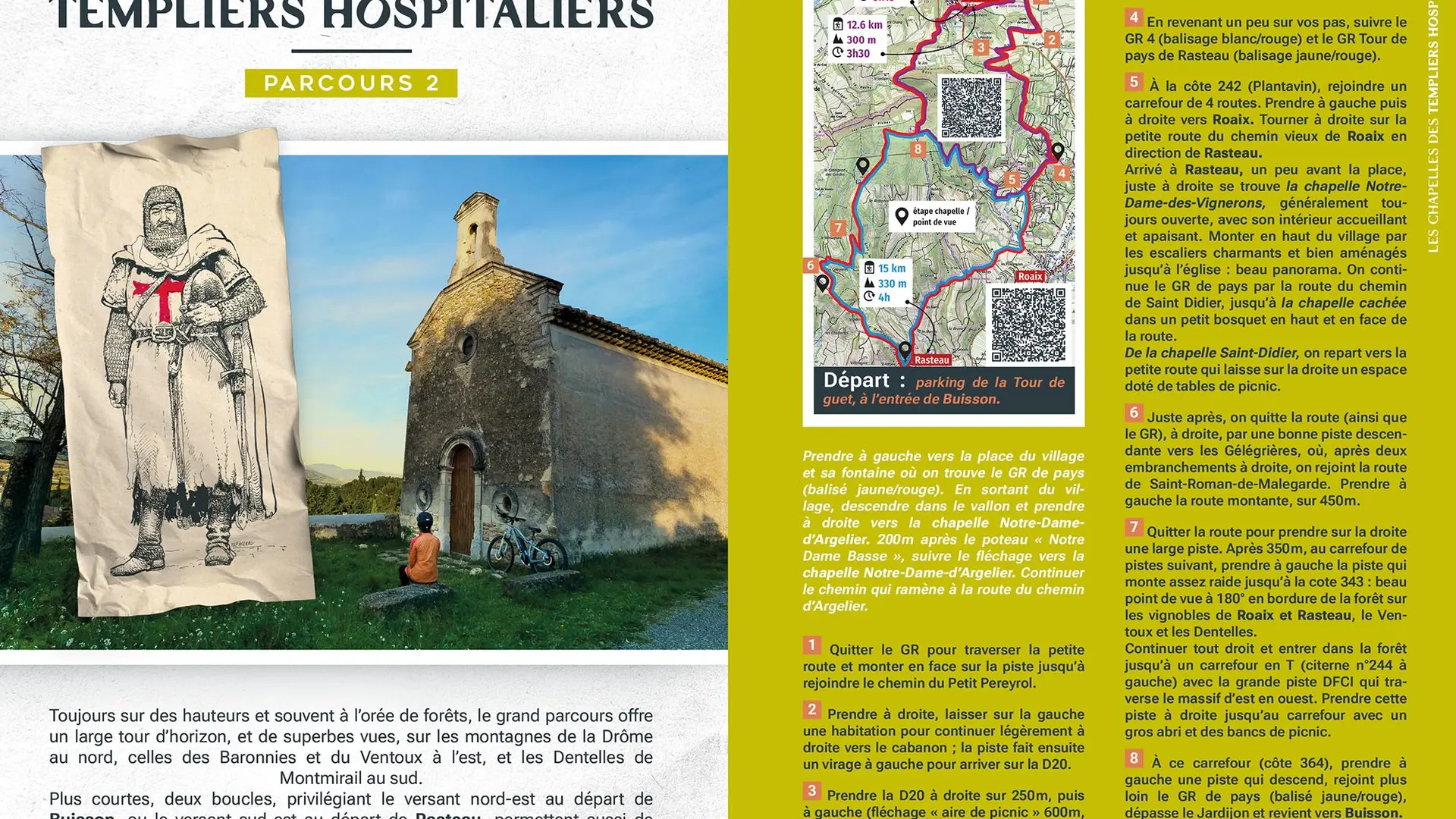 Au départ de Rasteau, un véritable tour d’horizon, avec des panoramas que le chemin enchaine, d’abord sur les montagnes de la Drôme, puis sur le Ventoux et les Dentelles de Montmirail, à travers des forêts de pins et de chênes verts, des vignobles fameux, et aussi des chapelles et commanderie méconnues … ce sont les terres Templières… et Hospitalières, si bien nommées !