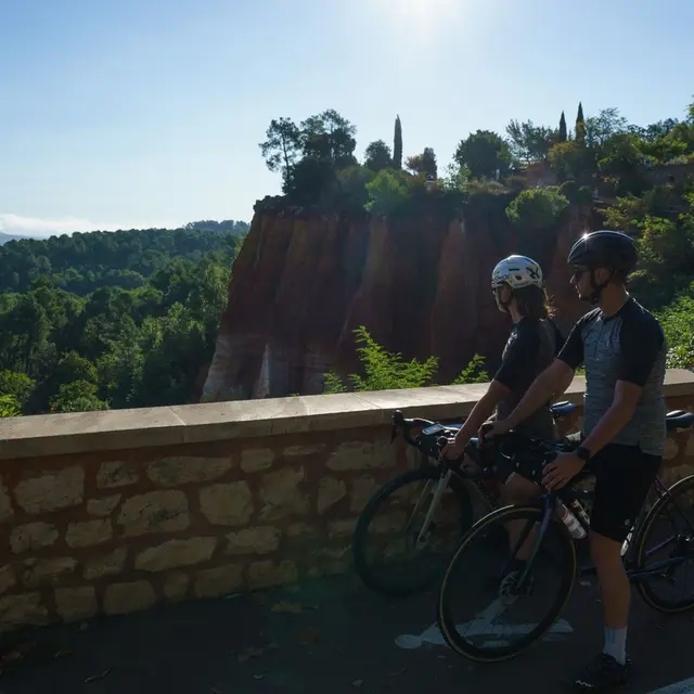 1- Après la pharmacie, filer droit et virer à droite à l'angle du cimetière. Poursuivre l'itinéraire balisé n°13 ''Les Ocres à vélo'', passer devant les Mines de Bruoux, traverser le hameau des Lombards puis, au stop, bifurquer à gauche en direction de Roussillon. Plus loin, traverser la D4 (prudence à la circulation !). Continuer sur le Chemin des Finets, puis gravir la D199.