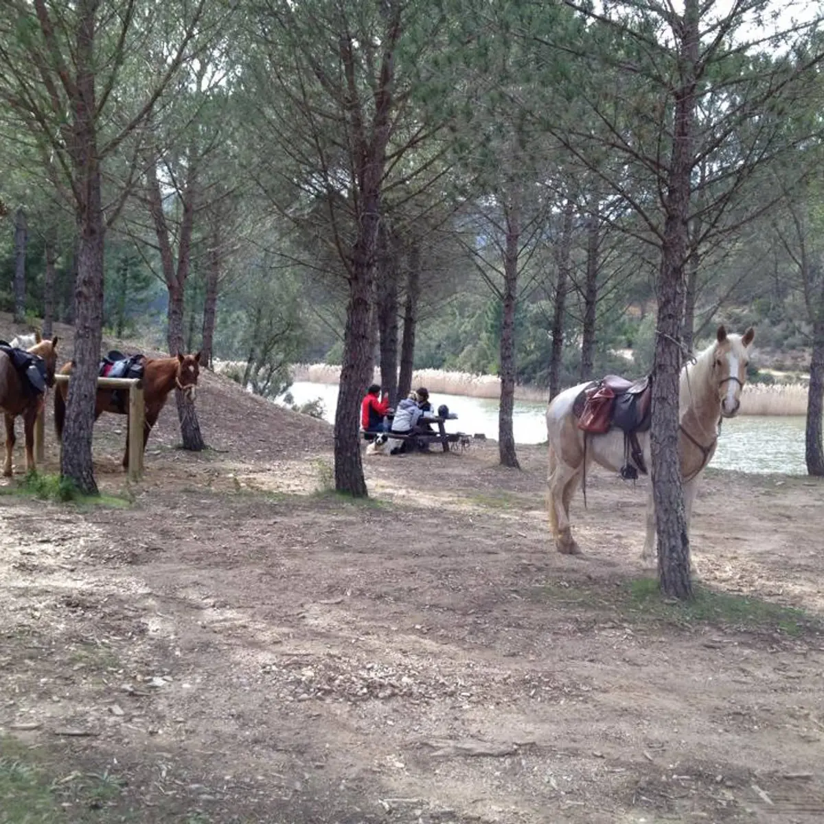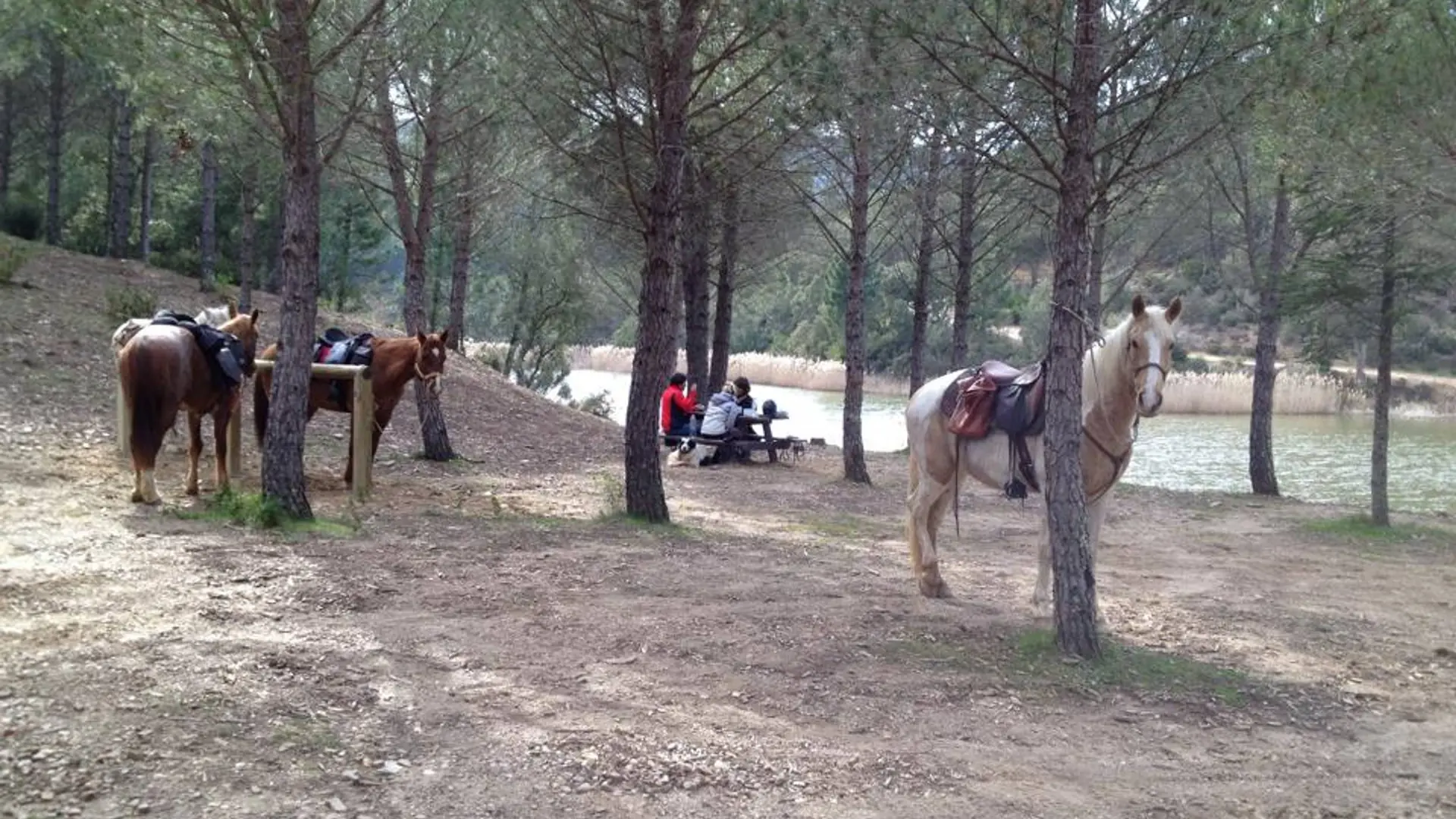 Chevaux équipés pour la pratique de l'équitation d'extérieur, eau et provisions.