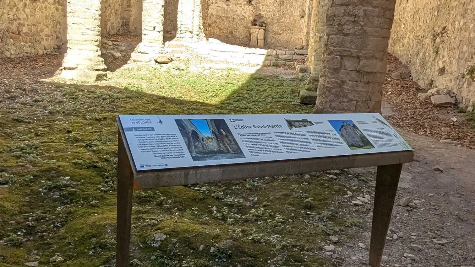 L'église Saint-Martin jouxtant le vieux cimetière fut l'église paroissiale de Volonne du Moyen-Âge au début du XVIe siècle. Aujourd’hui du vénérable sanctuaire, qui subit un incendie vers 1830, ne subsistent plus que d’émouvantes ruines à ciel ouvert. Déblayées en 1966-67 par le mouvement Alpes de Lumière, consolidées ensuite, elles ont étaient classées MH en 1971. C’est une église de plan basilical, sans transept, composée d’une nef et de deux collatéraux de cinq travées respectivement terminées par une abside et deux absidioles semi circulaires, toutes trois voûtées en cul-de-four.