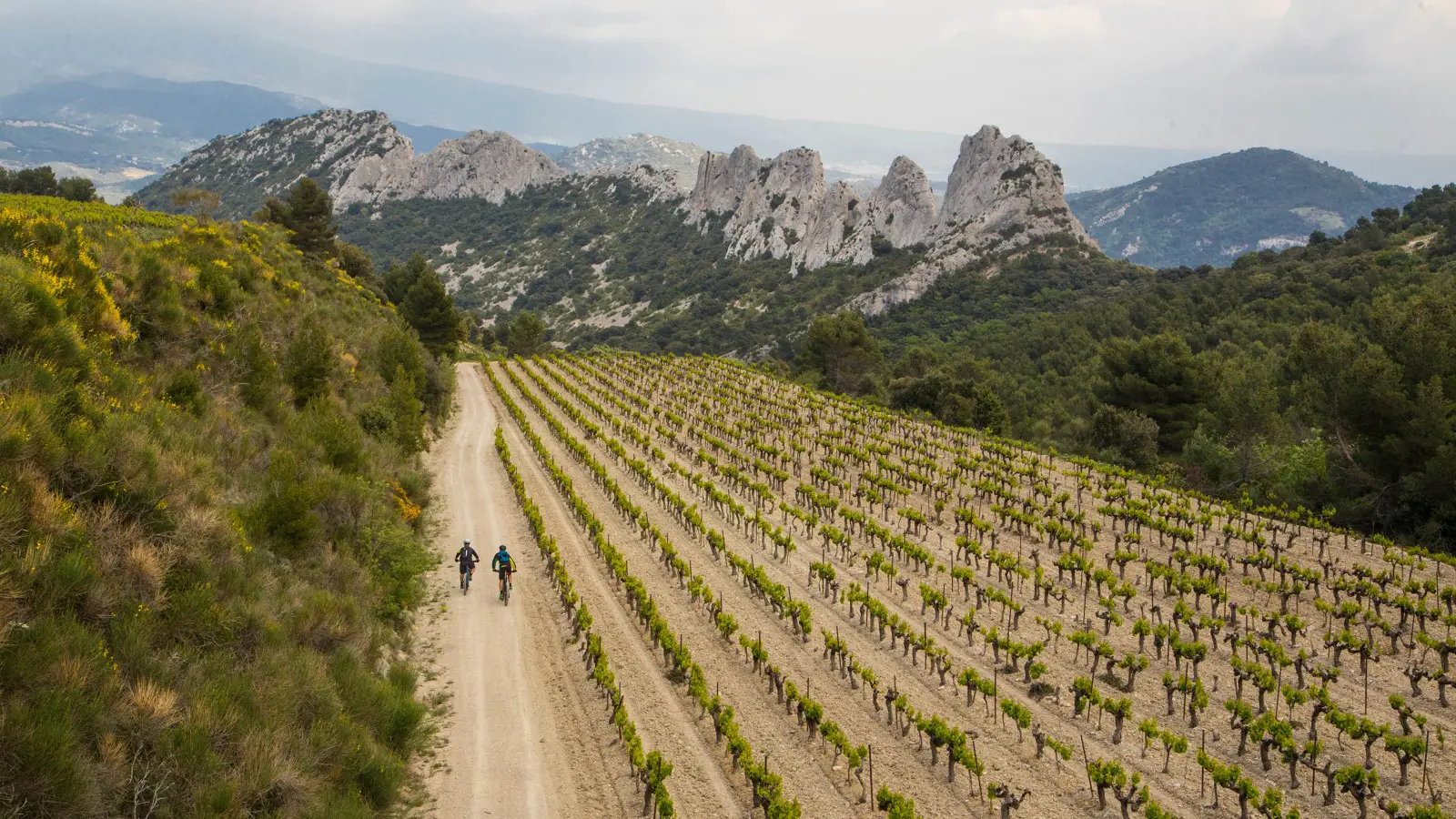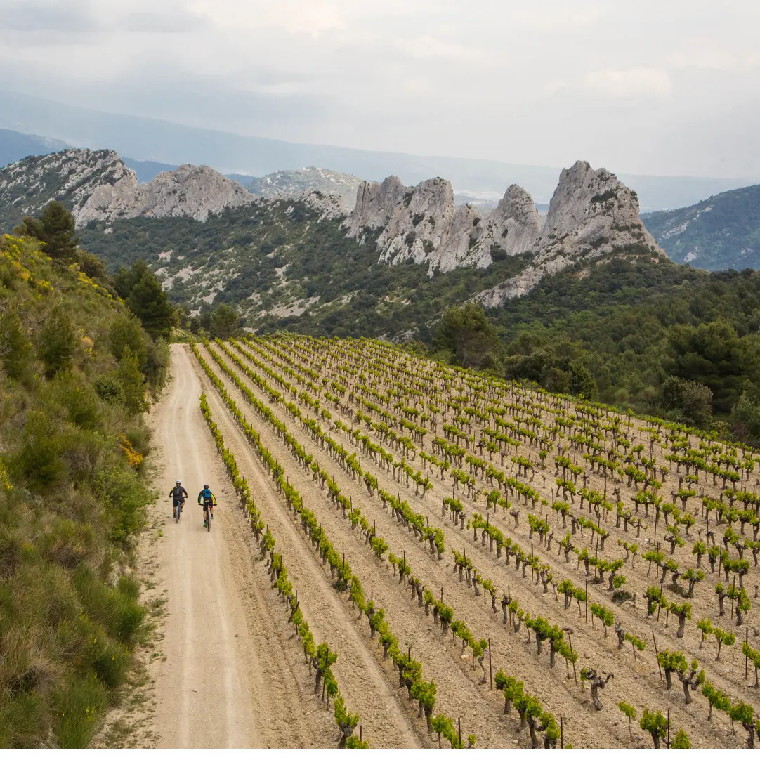 Après un première ascension du Géant de Provence, l'itinéraire traverse le Massif des Dentelles de Montmirail, paradis des cyclistes, des grimpeurs et des amateurs de crus des Côtes du Rhône.