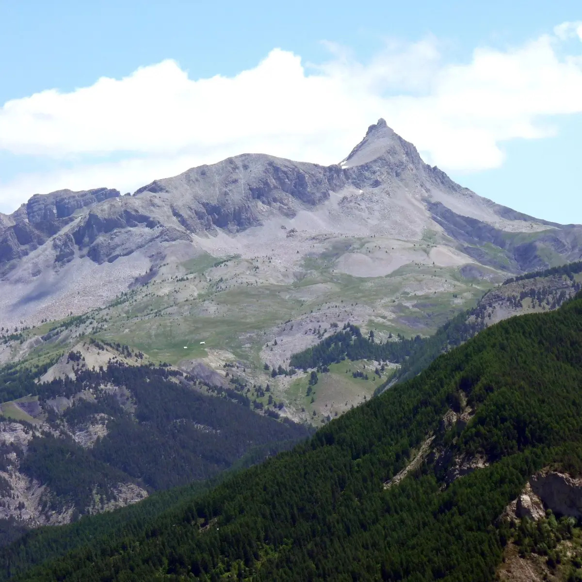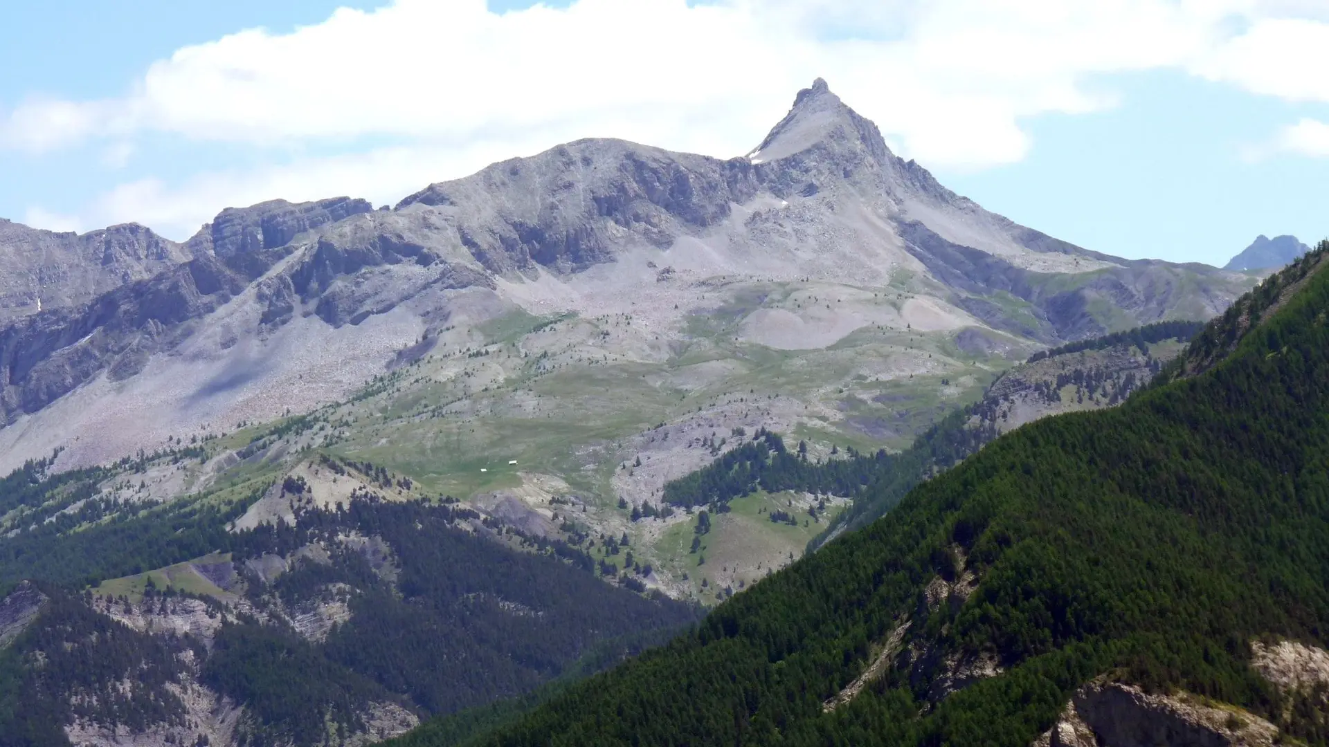 Au niveau du poteau Croix du Puy (1 668 m), commencer la descente dans le versant sud jusqu'à un carrefour. Prendre à gauche, passer à proximité d'une ruine puis descendre en lacets dans des terres noires jusqu'à un nouveau croisement.