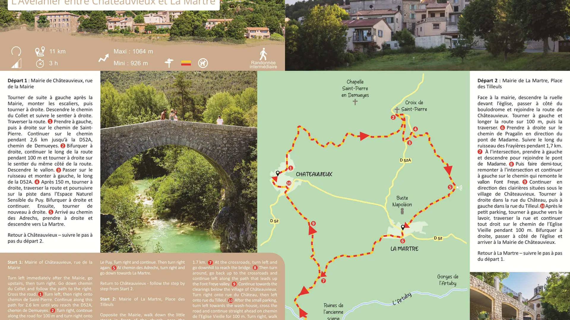 Tourner de suite à gauche après la Mairie, monter les escaliers, puis tourner à droite. Descendre le chemin du Collet et suivre le sentier à droite. Traverser la route. 1. Prendre à gauche, puis à droite sur le chemin de Saint-Pierre. Continuer sur le chemin pendant 2,6 km jusqu’à la D52A, chemin de Demueyes. 2. Bifurquer à droite, continuer le long de la route pendant 100 m et tourner à droite sur le sentier du même côté de la route. Descendre le vallon. 3. Passer sur le ruisseau et monter à gauche, le long de la D52A. 4. Après 150 m, tourner à droite, traverser la route et poursuivre sur la piste dans l’Espace Naturel Sensible du Puy. Bifurquer à droite et continuer. Ensuite, tourner de nouveau à droite. 5. Arrivé au chemin des Adrechs, prendre à droite et descendre vers La Martre. Face à la mairie, descendre la ruelle devant l’église, passer à côté du boulodrome et rejoindre la route de Châteauvieux. Tourner à gauche et longer la route sur 100 m, puis la traverser. 6. Prendre à droite sur le chemin de Pragalin en direction du pont de Madame. Suivre le long du ruisseau des Frayières pendant 1,7 km. 7. À l'intersection, prendre à gauche et descendre pour rejoindre le pont de Madame. 8. Puis faire demi-tour, remonter à l'intersection et continuer à gauche sur le chemin qui remonte le vallon Font Freye. 9. Continuer en direction des clairières situées sous le village de Châteauvieux. Tourner à droite dans la rue du Château, puis à gauche dans la rue du Tilleul. 10. Après le petit parking, tourner à gauche vers le lavoir, traverser la rue et continuer tout droit sur le chemin de l’Eglise Vieille pendant 100 m. Bifurquer à droite, passer à côté de l’église et arriver à la Mairie de Châteauvieux.