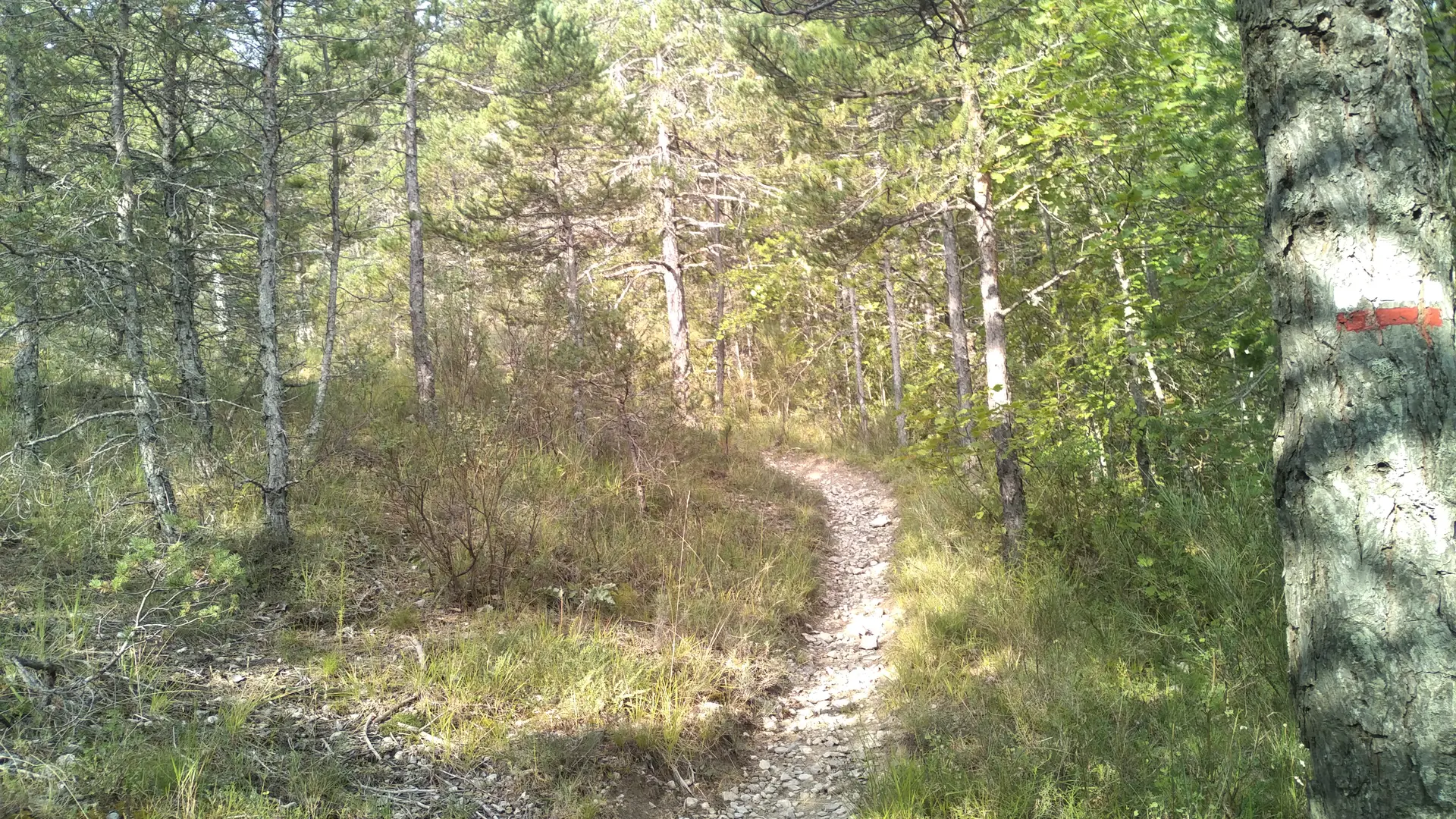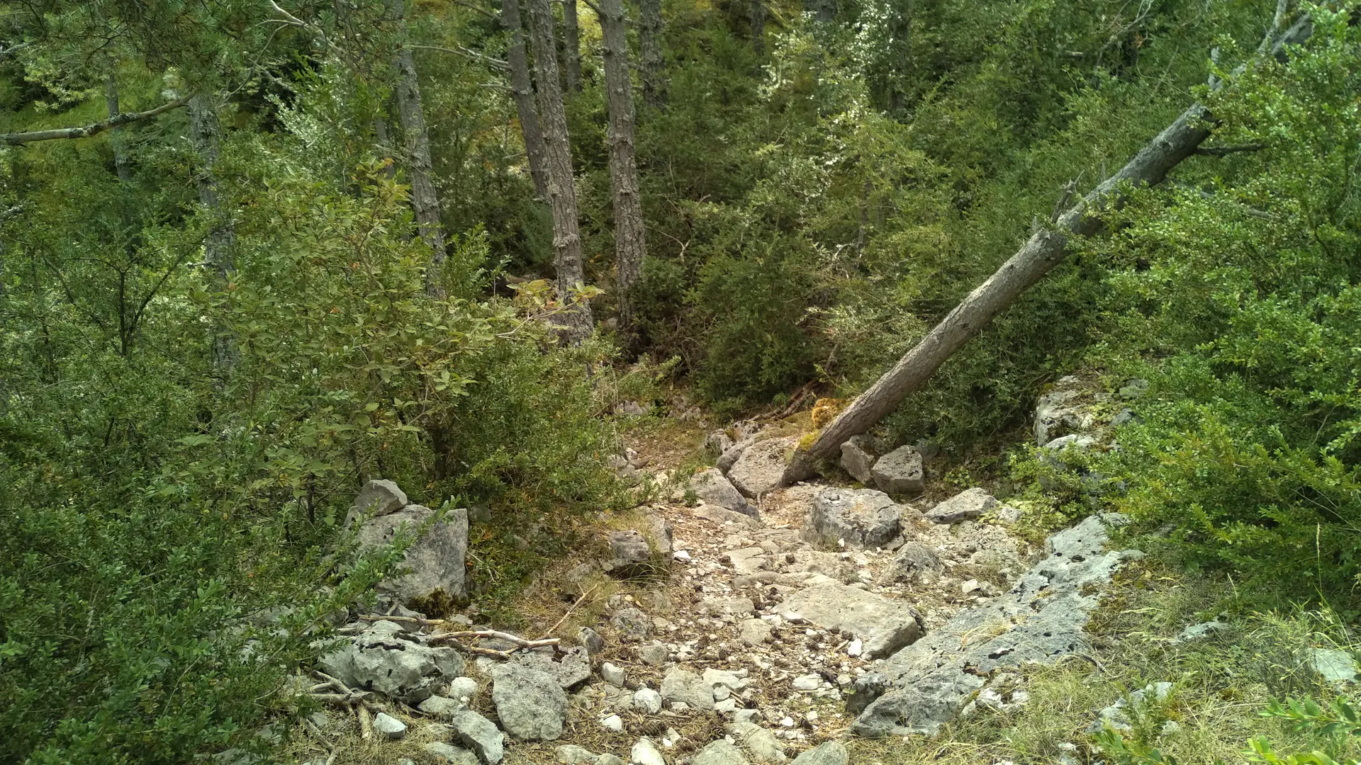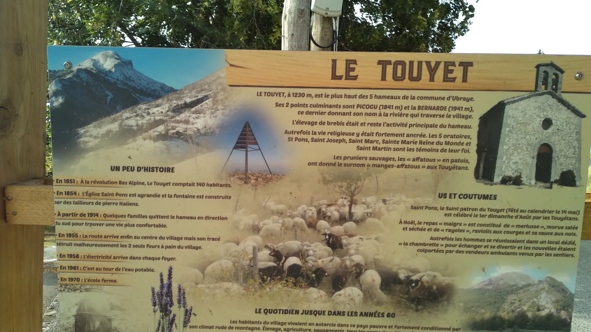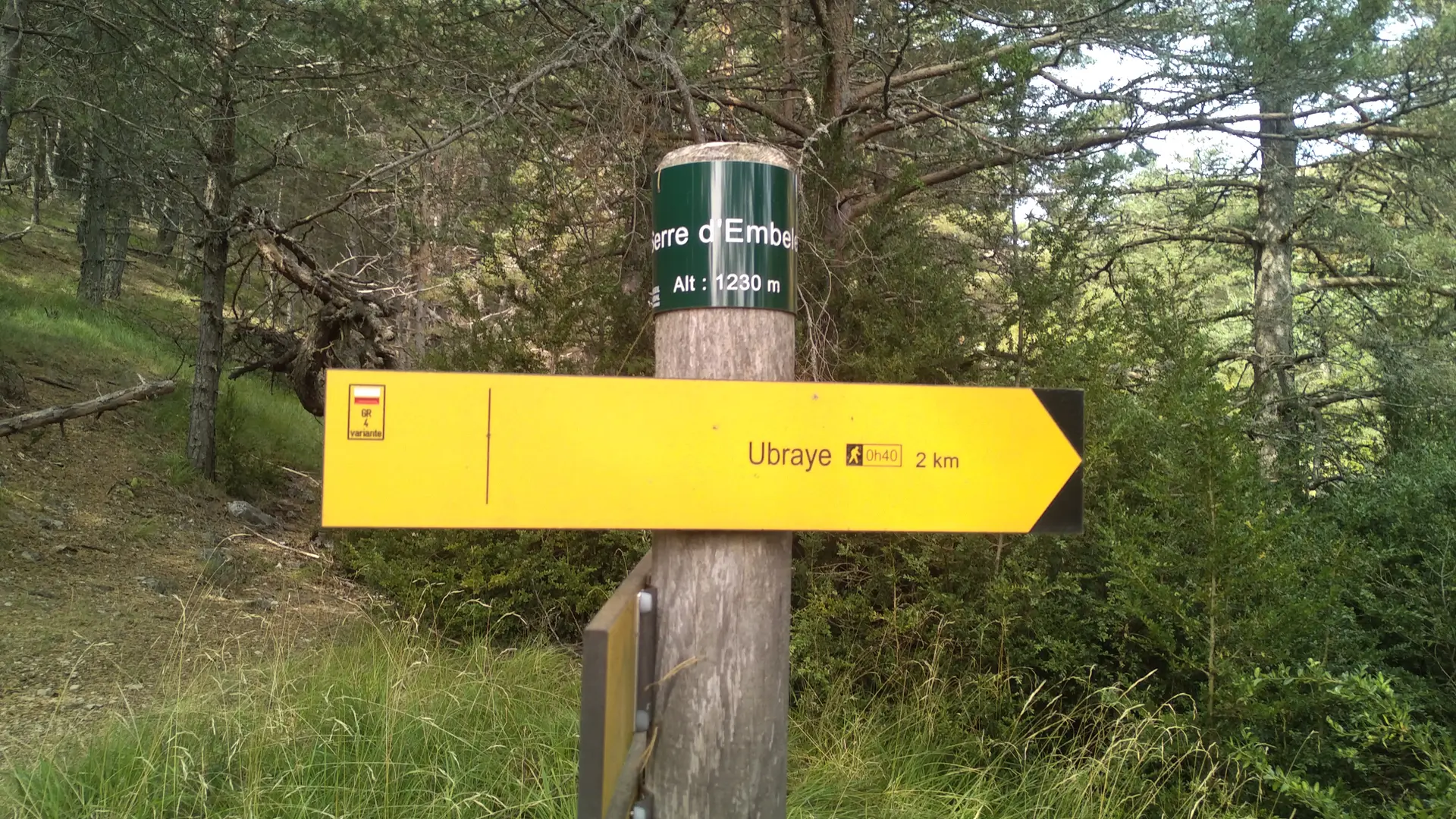 Descendre la montée de St Martin jusqu'au niveau de la balise indiquant la direction du Touyet. (balisage blanc-rouge). S'engager alors sur un petit sentier rocailleux qui s'élève progressivement dans une forêt de pins et de chênes. Après environ 400m de distance, le sentier rejoint la route. La suivre sur 50m, puis au niveau d'un cairn, reprendre le sentier qui s'élève alors à flanc, et passe devant une joli croix métallique. Admirez alors la vue sur le sommet du Picogu à gauche, et le hameau du Touyet à droite. Le sentier passe sous les maisons, et débouche de nouveau sur la route. La suivre, passer sur le pont, puis continuer jusqu'aux petites maisons du Touyet Haut. Prendre la piste bitumée qui s'élève sur la droite, jusqu'à un panneau de signalisation routière (interdiction au plus de 3.5 tonnes) puis celle en terre qui part sur la gauche. Elle descend dans le ravin de la Bernarde. Un petit gué permet de traverser le ruisseau. Remonter en face et rejoindre le joli plateau de la Palud à 1250m d'altitude. Suivre alors les balises jaunes, direction d'Ubraye, jusqu'à la balise indiquant le Serre d'Embelet, à 1230m d'altitude. Retrouver alors le GR4, (balisage rouge et blanc), et redescendre en direction d'Ubraye. Le sentier passe dans une belle forêt de buis, de pins et quelques feuillus. Il présente localement de petites marches calcaires et il offre une jolie vue sur le sommet de la Charita et le village d'Ubraye. Retraverser le ruisseau de la Bernarde avant de remonter par une piste terreuse sous les maisons du village.