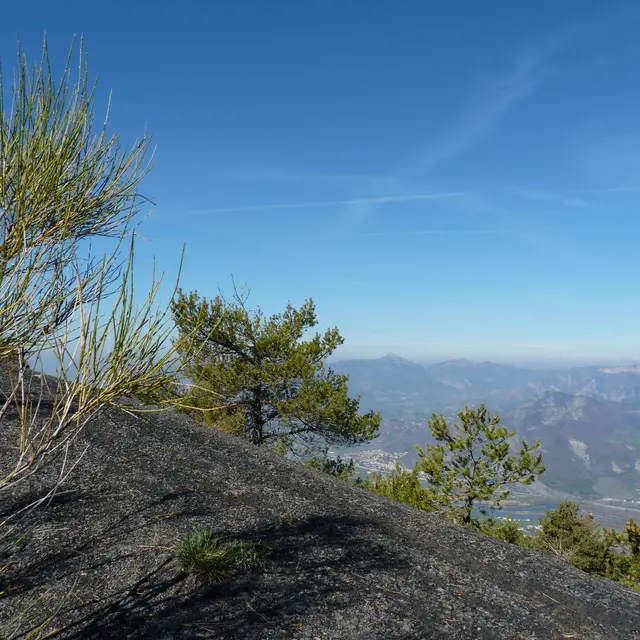 4. Attention de ne par rater l'embranchement, 100 mètres plus loin, pour la suite de l'itinéraire. Laisser la piste forestière pour emprunter un sentier sur la gauche, très raide sur les 3 premiers mètres, s'enfonçant dans le sous-bois. Poursuivre sur les crêtes de la marnière. Arpenter des sentiers aériens, offrant une vue splendide sur le bassin gapençais et ses montagnes emblématiques, tels que Céüse, le Pic de Bure, mais aussi le Vieux Chaillol et la chaîne de Piolit à Chabrières.