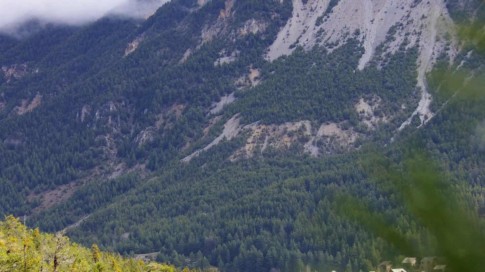 La piste longe un petit cimetière , restez sur cette large piste principale pour bifurquer à gauche ( indications par un balisage jaune :" Le Rosier par les balcons de l'Enrouye" ) . Cette piste forme un large virage pour s'élever en foret jusqu'à rejoindre un pierrier et se transformer alors en petit sentier ( dans le pierrier , ignorez la piste forestière de votre gauche ) .