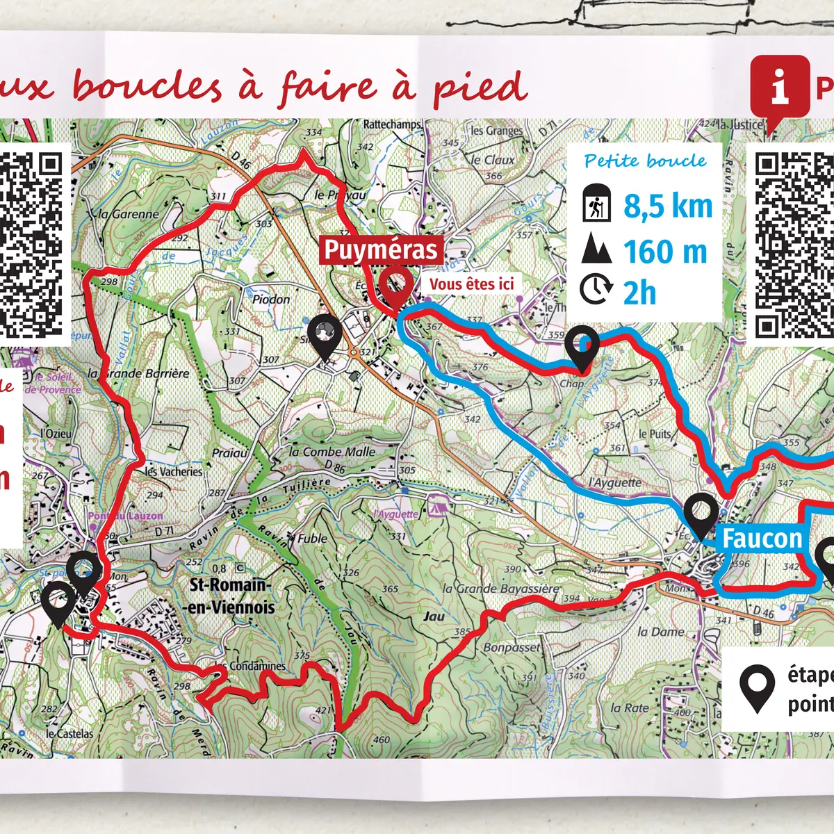 Parcourir ces « collines heureuses », comme aimait les appeler Giono en Provence : celle de Faucon, avec le chemin qui s’enroule autour de ce village perché, celle de la belle forêt de Jau avec ses ouvertures de vergers, celles qui ondulent entre Saint-Romain-en-Viennois et Puyméras en longeant la rivière du Lauzon.