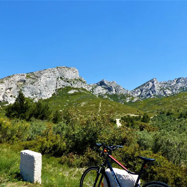 Suivre les panneaux rouge et blanc intitulés "Alpilles Roquemartine" du Conseil départemental des Bouches-du-Rhône, excepté au point n°4 du parcours.