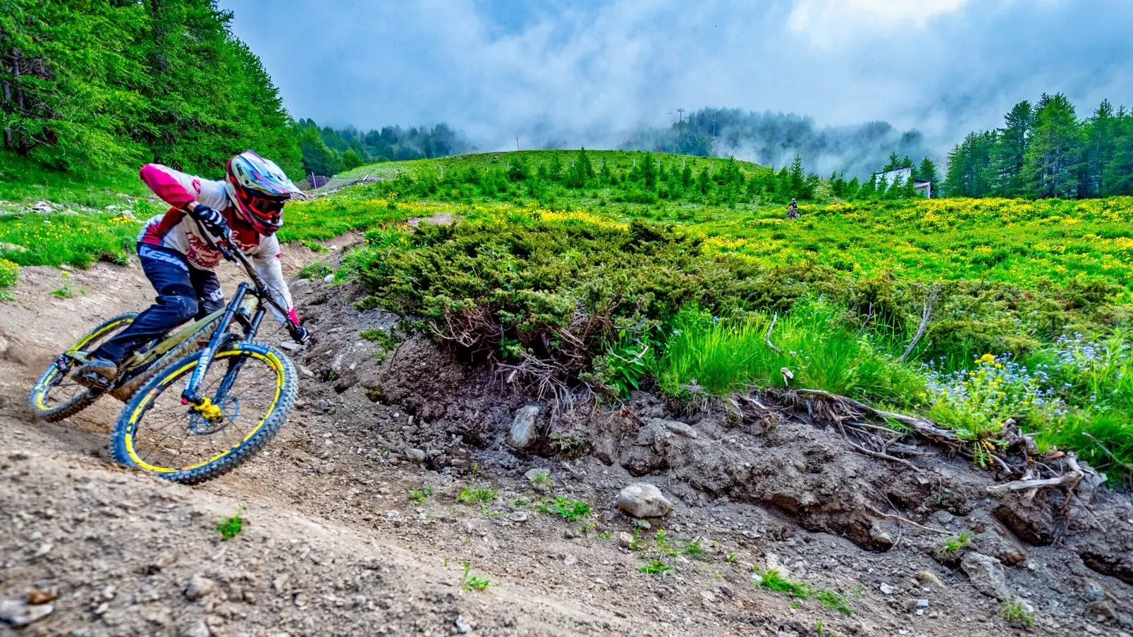 Vous retrouverez une première partie roulante agrémentée de gros sauts (toujours avec un échappatoire) et de gros virages sur le haut du domaine pour finir sur une deuxième partie en forêt qui suit les mouvements du terrain.