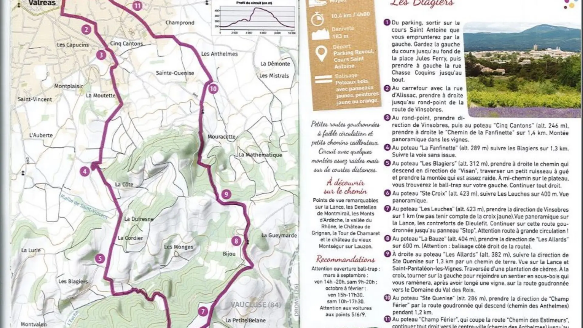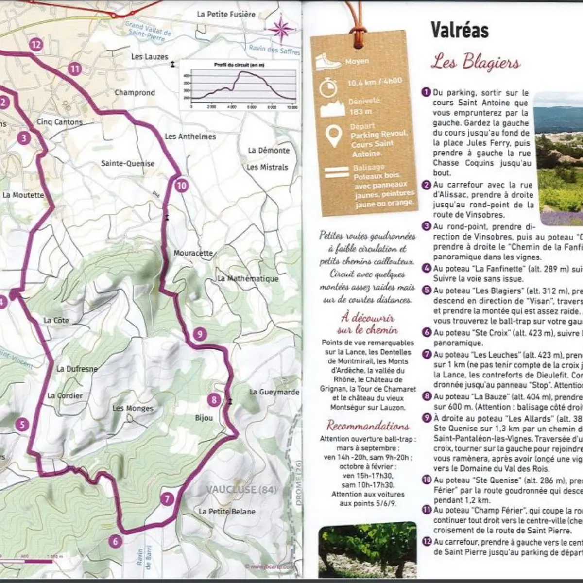 Boucle de randonnée de niveau moyen sur petites routes goudronnées à faible circulation et petits chemin caillouteux. Quelques montées assez raides mais sur de courtes distances.
