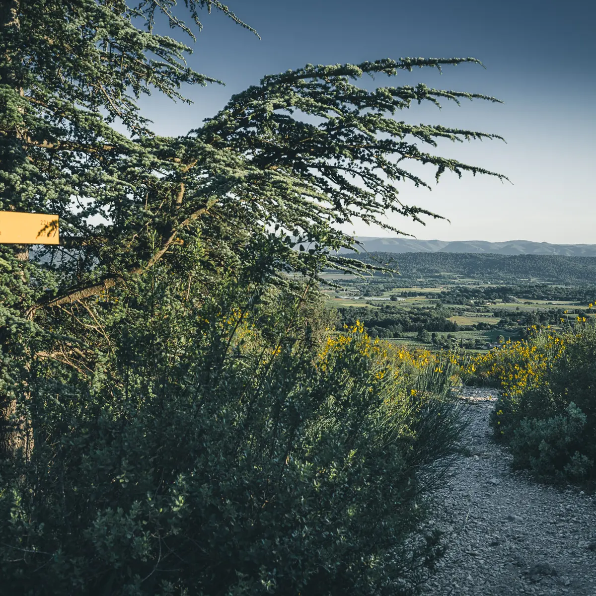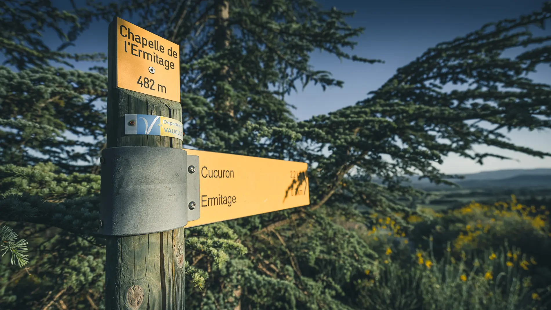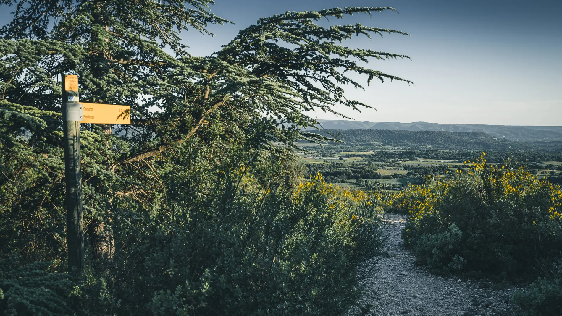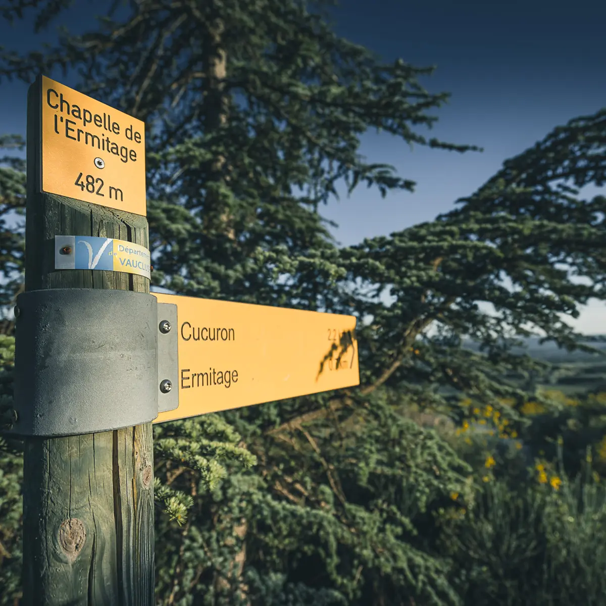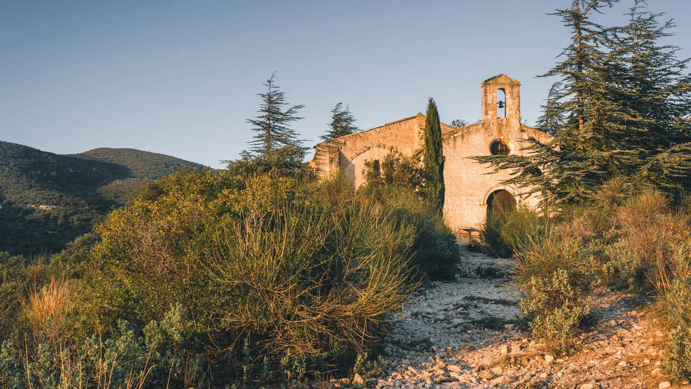 3- À l’intersection « l’Ermitage » prendre la direction de la Chapelle de l’Ermitage. Au niveau de la barrière, bifurquer à gauche sur le petit sentier et suivre les indications « la Chapelle ». Gravir le sentier jusqu’au sommet pour admirer un beau panorama sur la Vallée d’Aigues et le Luberon. Prudence aux chevilles lors de l’ascension !