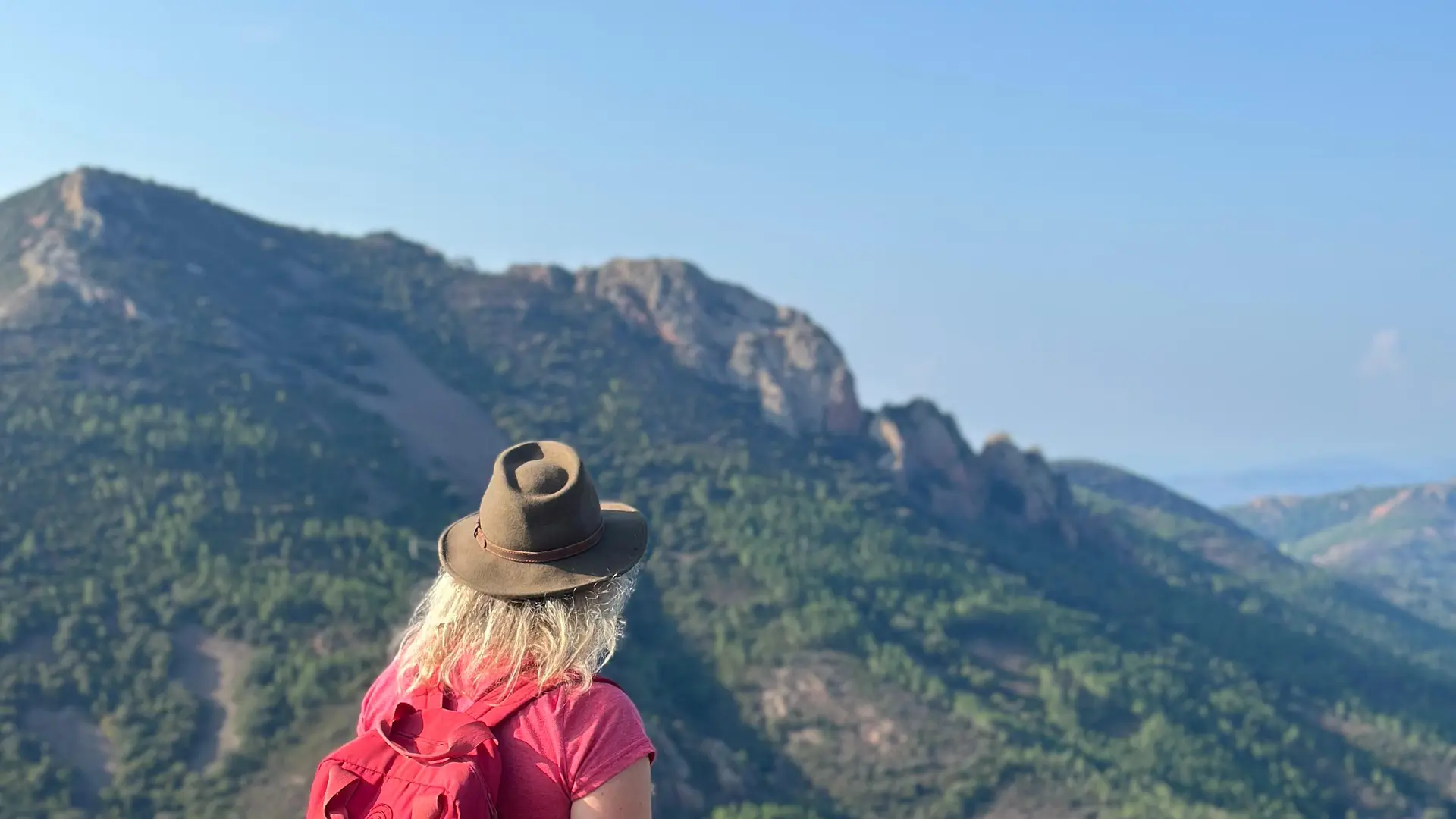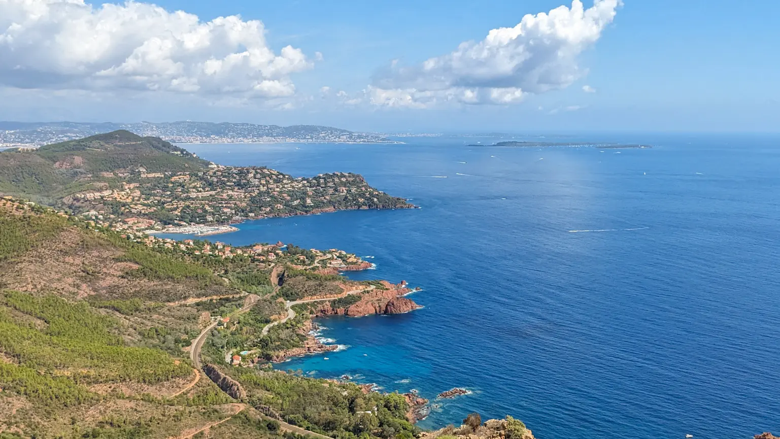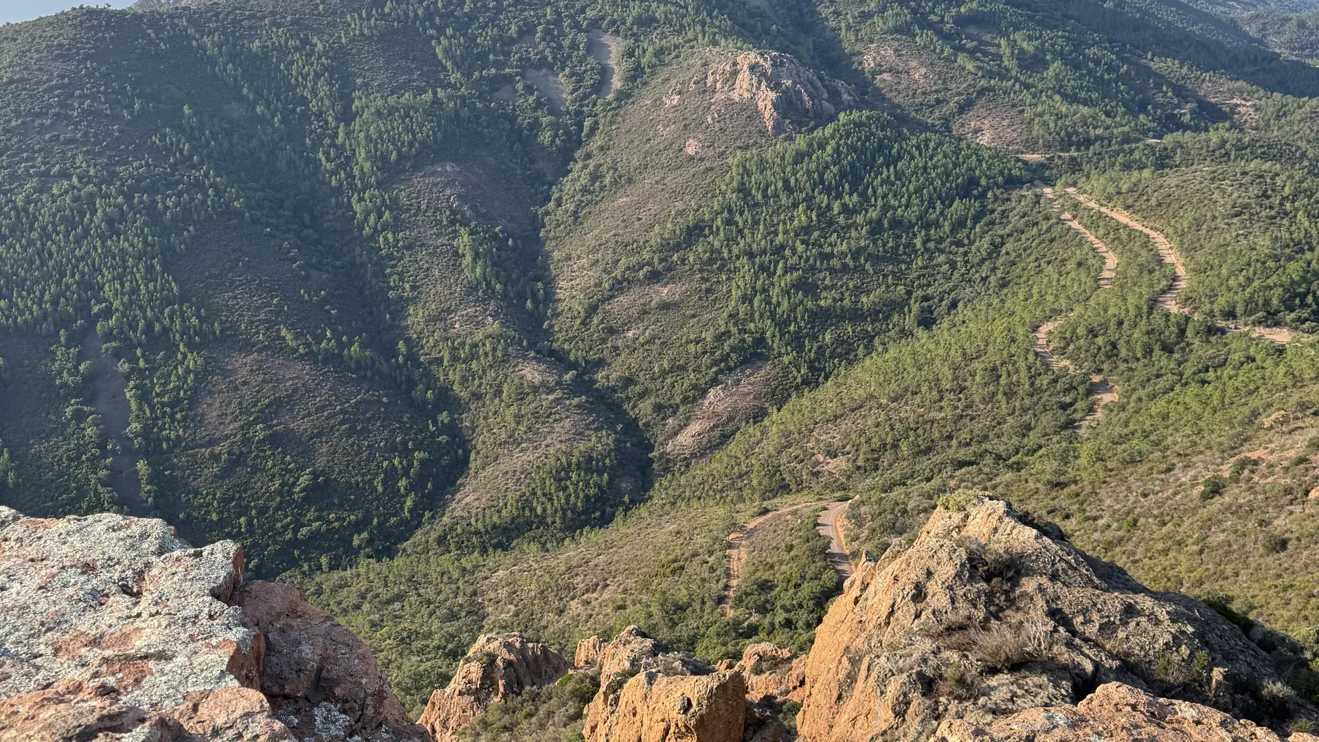 Le chemin s'élève, entamant sa partie plus rocheuse, en lacet. Le paysage s'ouvre au fur et à mesure de cette dernière petite ascension sur un panorama extraordinaire jusqu'à la baie de Cannes et aux Alpes.