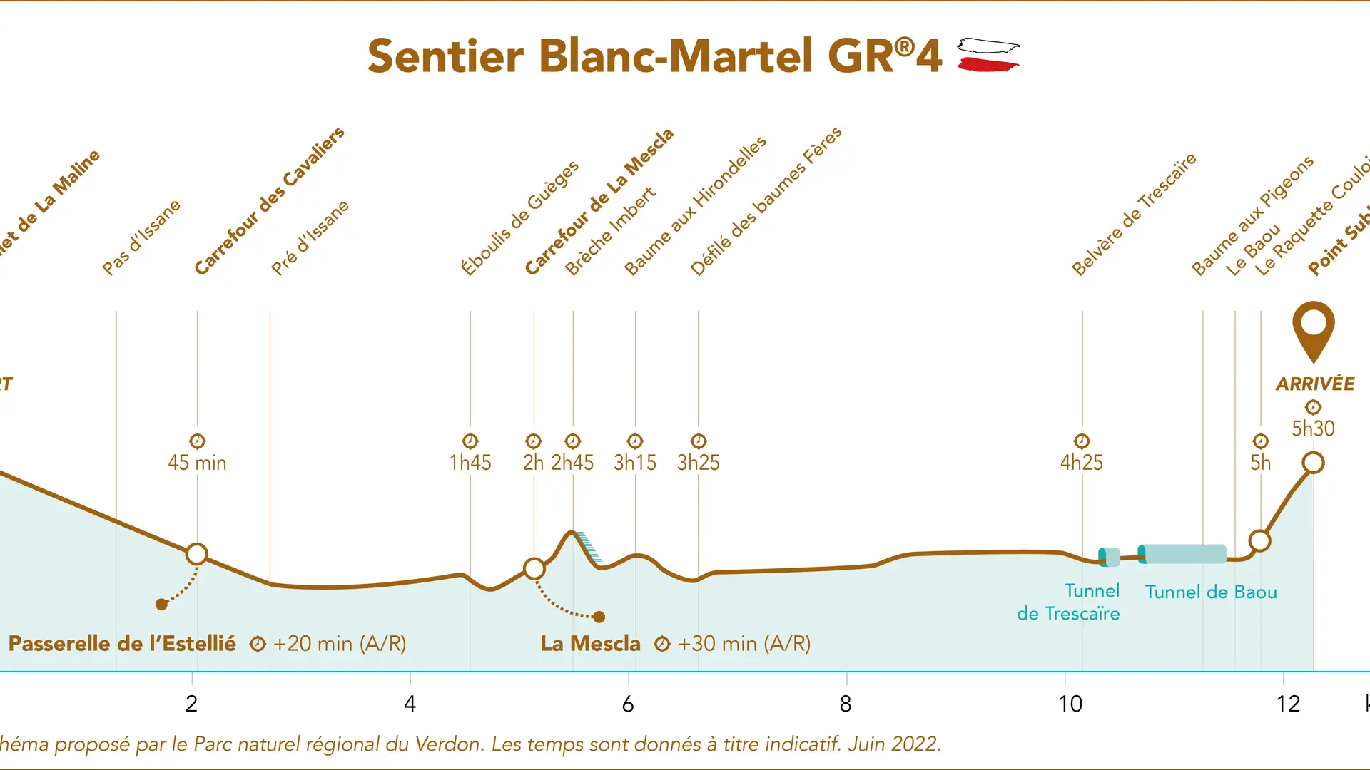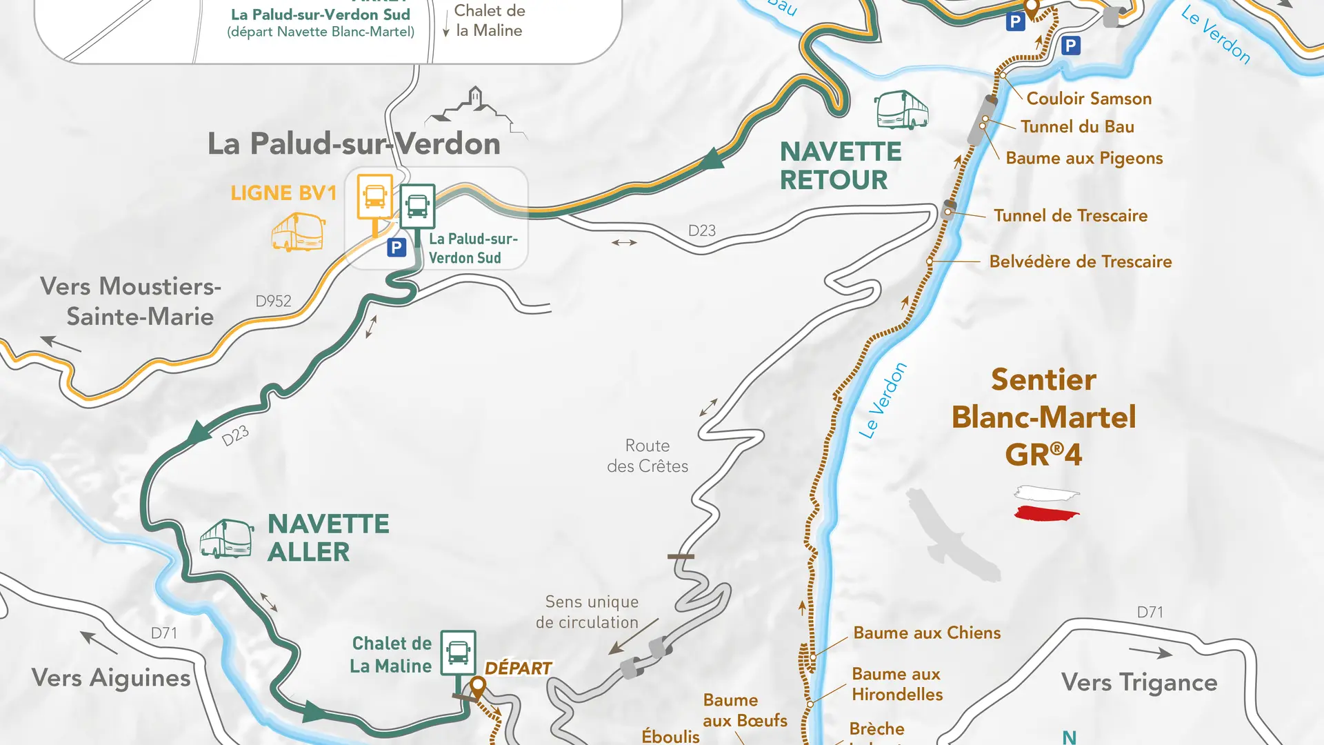Le sentier Blanc-Martel est un aller simple entre le Chalet de la Maline à La Palud-sur-Verdon et le Point Sublime à Rougon. Une navette est mise en place en saison : vous la prenez le matin à partir de la Palud-sur-Verdon, jusqu’au Chalet de la Maline (départs à 8h30, 9h30, 10h30 selon la période). Elle vous ramène ensuite l’après-midi du Point Sublime à La Palud-sur-Verdon (16h, 17h, 18h selon la période). Réservations en ligne uniquement : navette.parcduverdon.fr