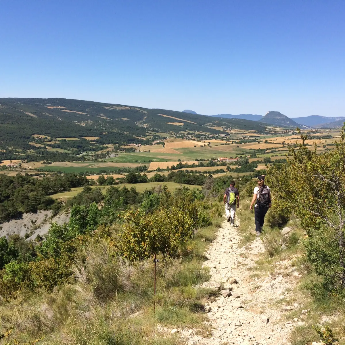 À l'intersection (poteau "Fontaine du Saule"), prendre un sentier en balcon sur votre gauche. Lorsque le paysage s'ouvre (rester attentif), l'itinéraire fait redescendre légèrement à gauche (2 clôtures à enjamber) pour atteindre un champ. Le longer et rejoindre une piste ravinée qui mène à l'embranchement du début ("La Viste"). Pour le retour, prendre le même itinéraire qu'à l'aller, direction "L'Epine".