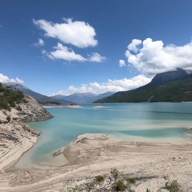 Depuis la Baie St-Michel, parcourez les rives du Lac de Serre-Ponçon sur plusieurs kilomètres. D’une montée à l'autre, passez par les différentes combes en terre noire. Traversez des zones de forêts apportant un ombrage salutaire par fortes chaleurs. En peu de temps, repassez aux abords du lac et profitez de la vue. En fin de parcours découvrez le célèbre viaduc de Chanteloube, totalement immergé en période estivale.