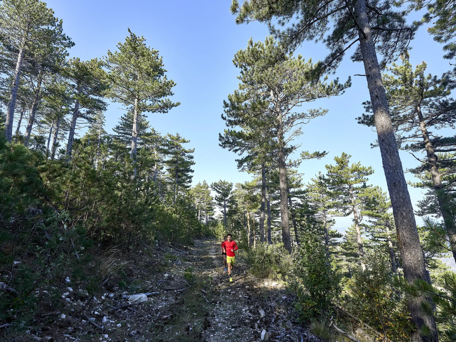 Vue en crête sur le Comtat Venaissin et les Alpes. Attention partie en crête souvent froide et ventée. Parcours majoritairement ombragé.