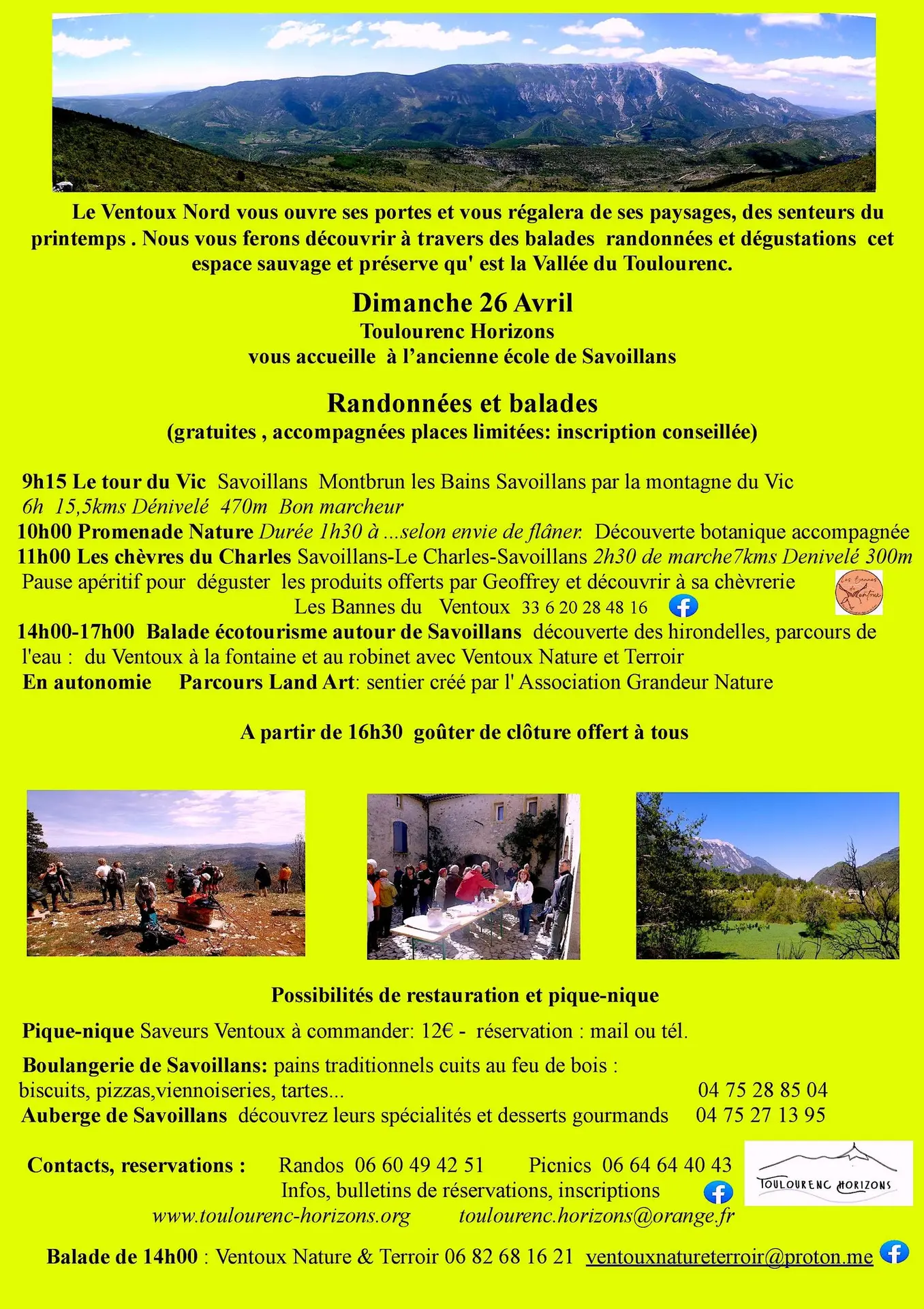 14h00 - 17h00 : "Balade écotourisme autour de Savoillans" découverte des hirondelles, parcours de l'eau : du Ventoux à la fontaine at au robinet avec Ventoux Nature et Terroir ( 06.82.68.16.21 ou [email protected])