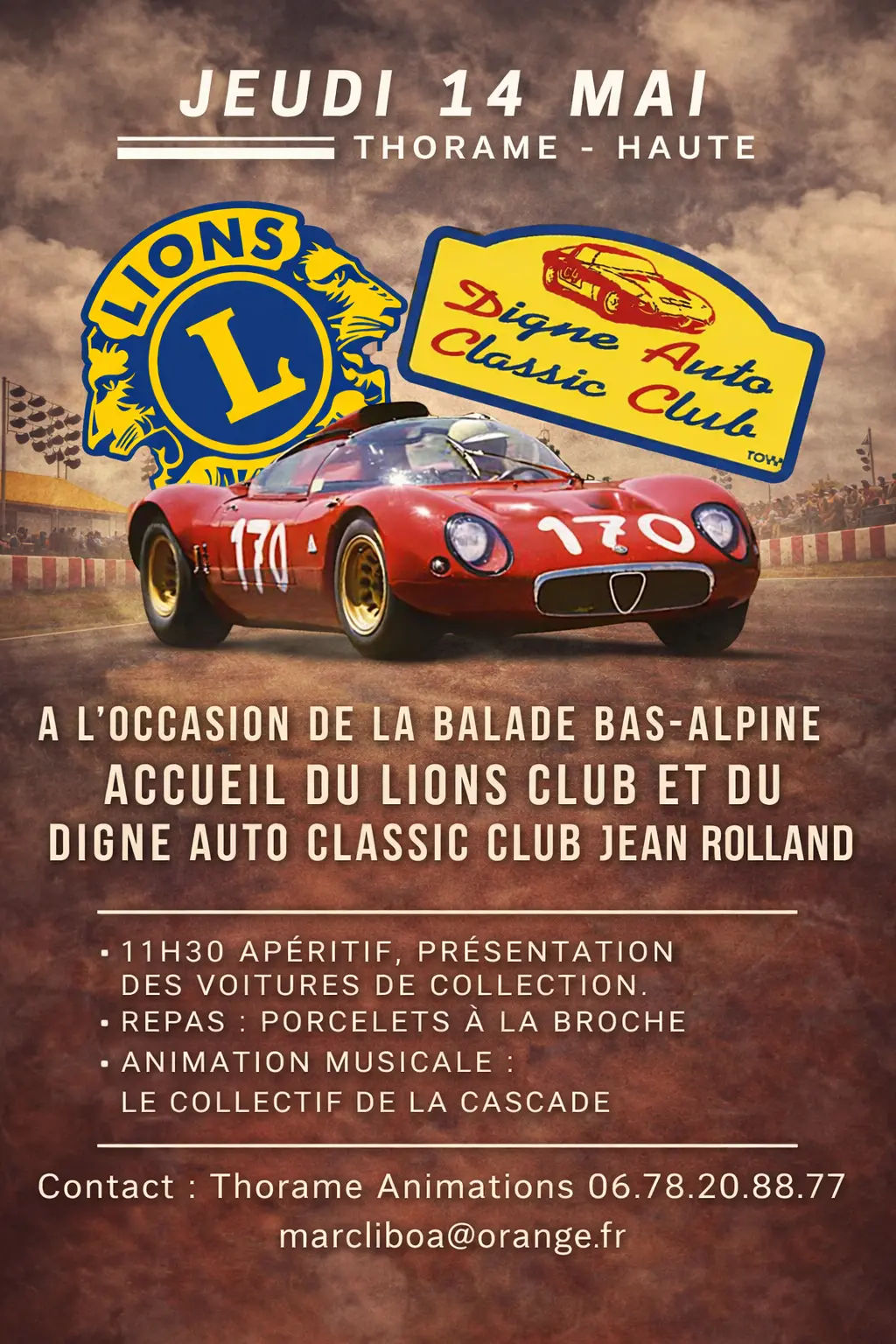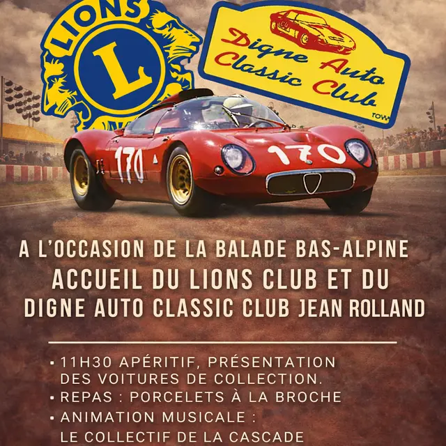 Accueil du Lions Club et du Digne Auto Classic Club Jean ROLLAND. Présentation des voitures de collection. 11h30 Apéritif, présentation des voitures de collection. Repas : porcelets à la broche.
