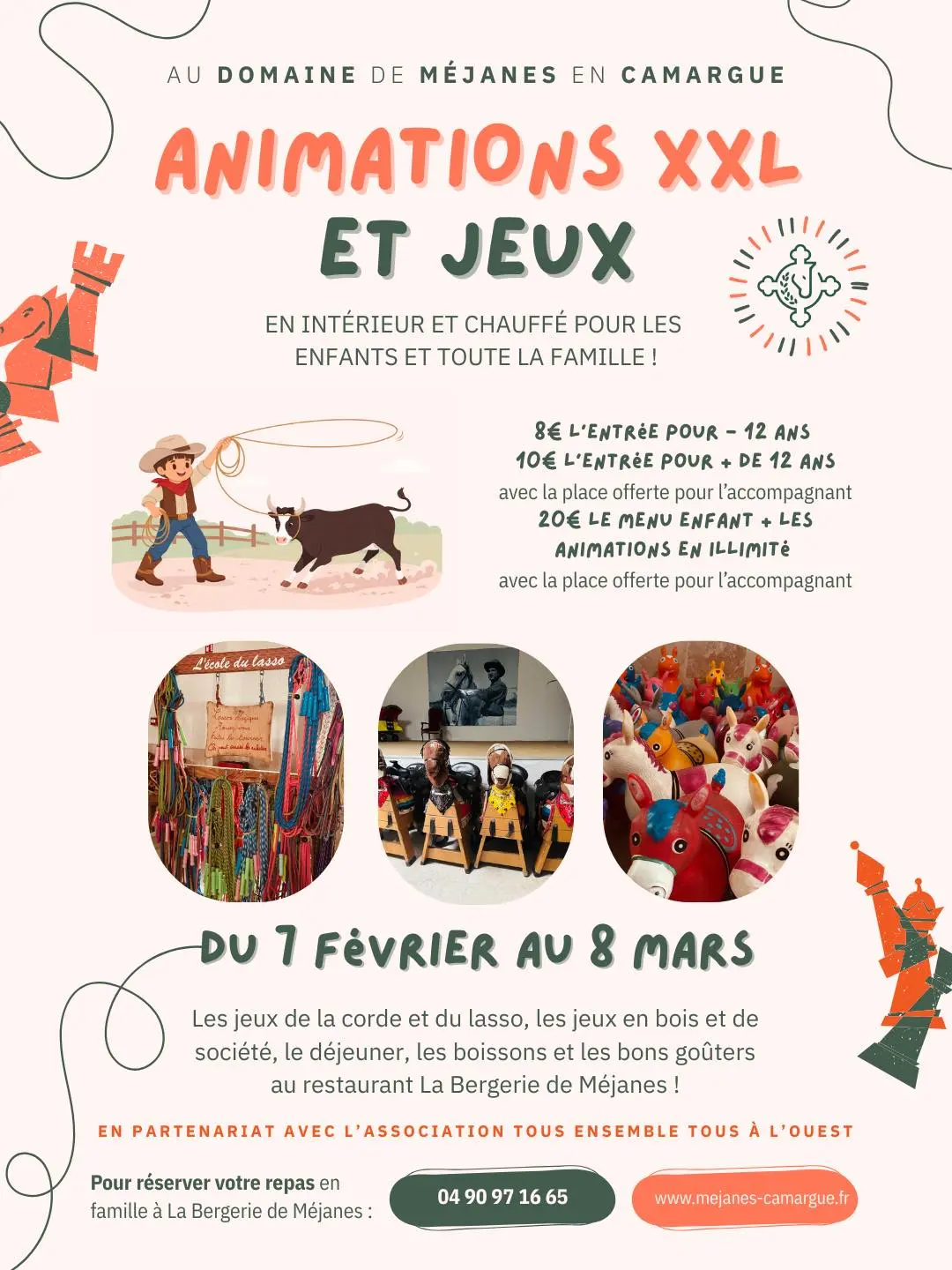 Donc à partir du samedi 7 février et jusqu’au dimanche 8 mars, au restaurant La Bergerie de Méjanes (avec ses jeux en bois et de société mis à disposition) et dans sa grande salle « Salon Mirette », l’Ecole du Lasso animée par nos partenaires Jumper & Jenny de l’association « Tous ensemble Tous à l’ouest ».