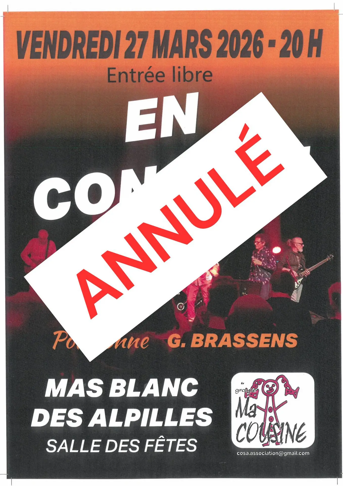 ANNULÉ - Soirée exceptionnelle avec la venue des six soixantenaires énergiques du groupe « Ma cousine » qui vous proposent de fredonner avec eux les refrains inoubliables des multiples chansons de Georges Brassens sur des orchestrations dynamiques
