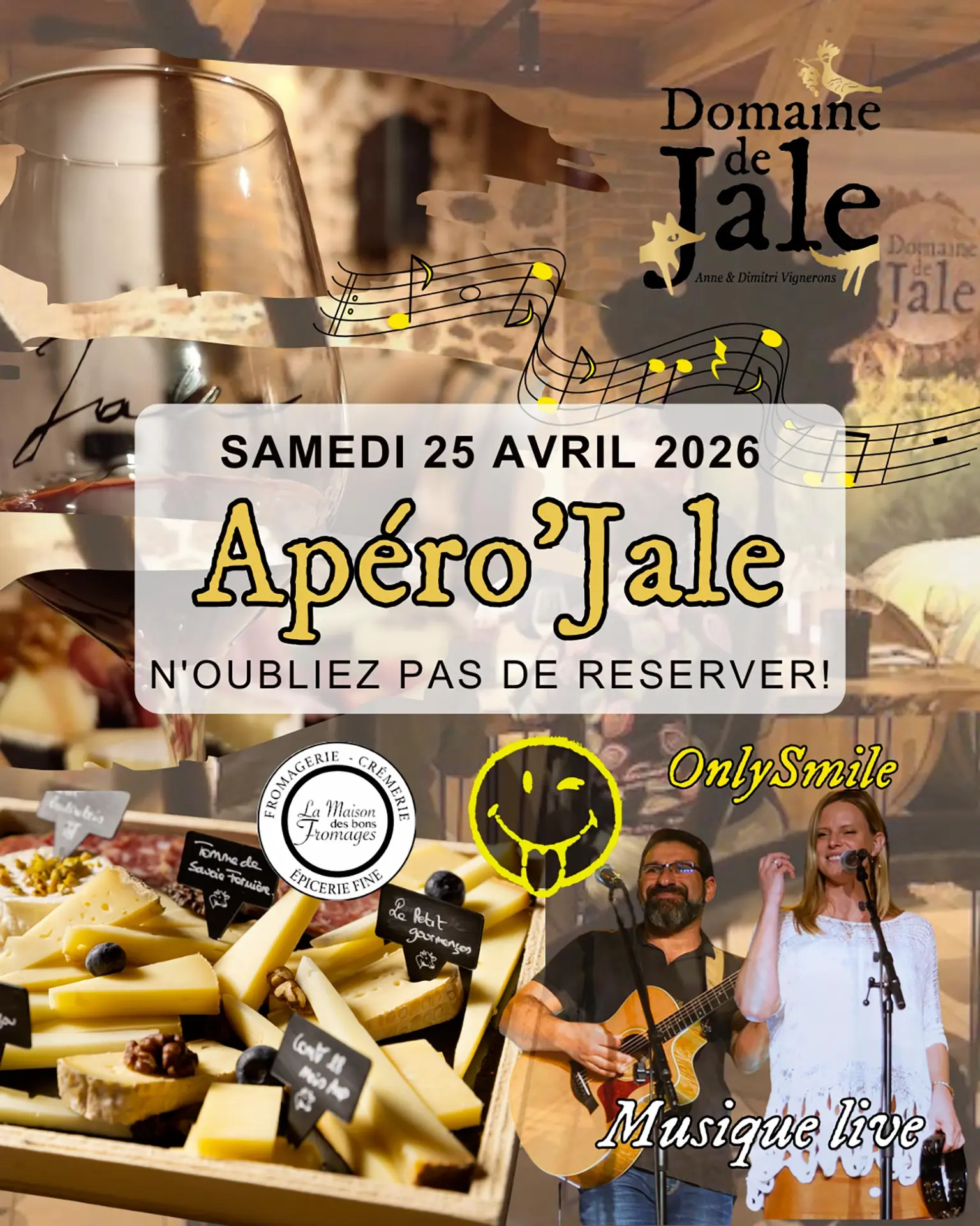 Dégustation des vins du Domaine, accompagnée des plateaux de fromage et charcuterie de La Maison des Bons Fromages. Musique live avec Only Smile (pop/ folk/ rock).