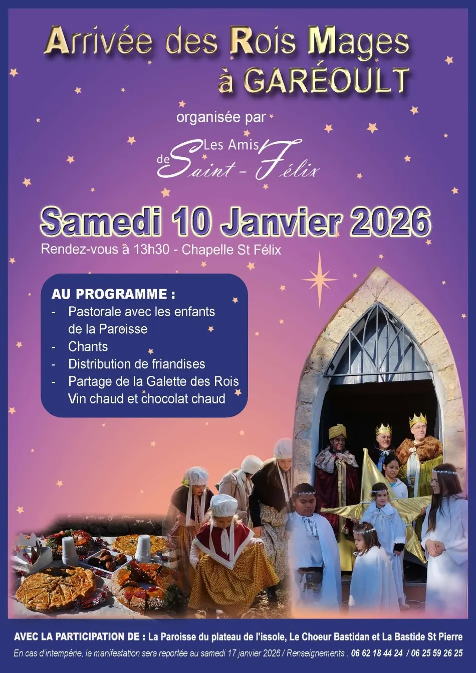 Venez célébrer l'arrivée des rois Mages à la Chapelle Saint Félix. Pastorale par les enfants de la Paroisse, Chants, Distribution de friandises, partage de la galette des Rois, vin chaud et chocolat chaud.