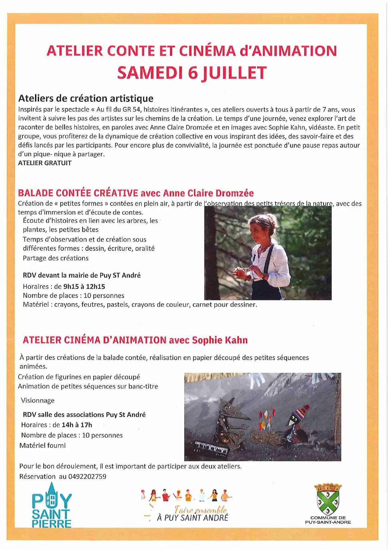 Venez découvrir les ateliers contes et cinéma d'animation avec les ateliers de création artistique inspirés par le spectacle "au fil du GR54", une balade contée créative ainsi qu'un atelier cinéma d'animation.