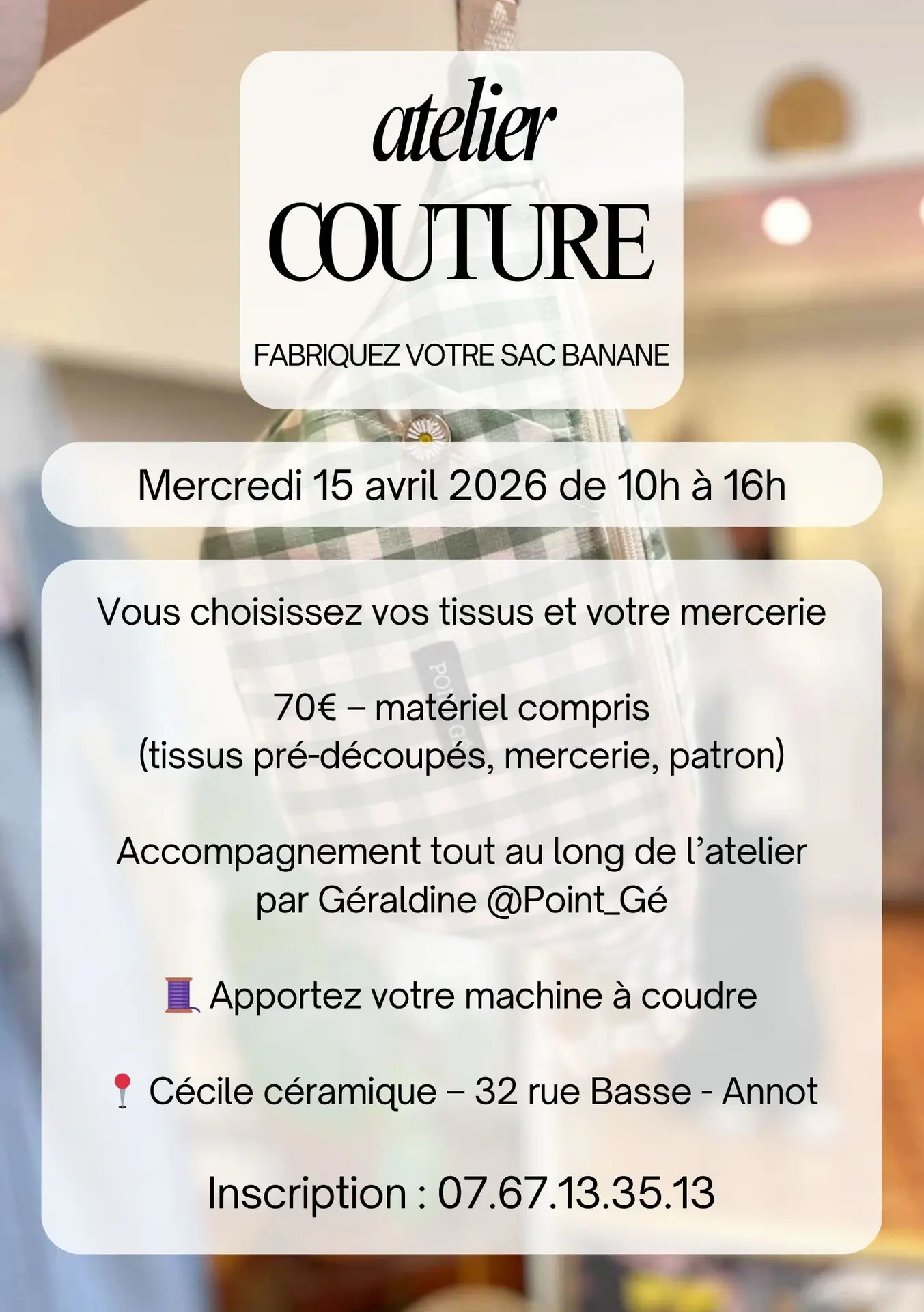 Je vous propose un atelier couture dans ma boutique, animé par Géraldine (@Point_Gé), pour une journée créative et conviviale. Vous réalisez votre propre sac banane, en choisissant vos tissus et votre mercerie. Tout est prévu pour vous accompagner pas à pas, même si vous débutez.