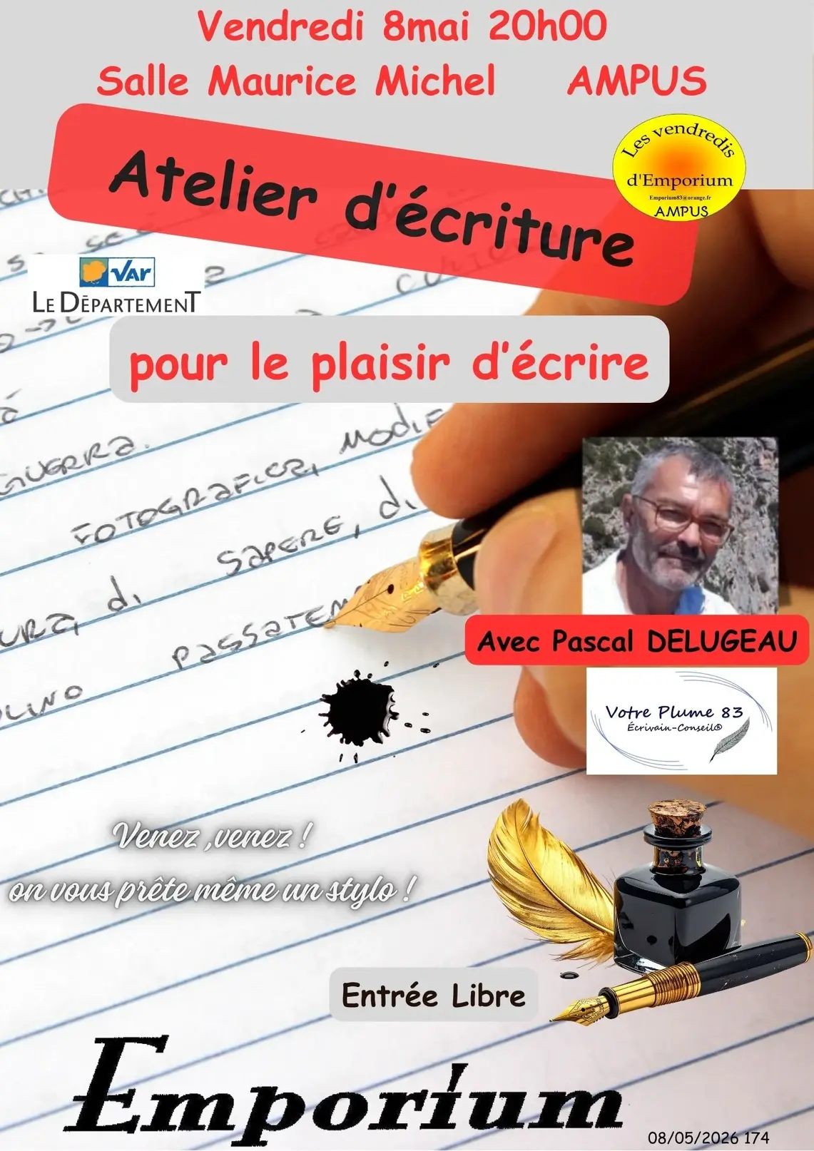 Animé par Pascal Delugeau, écrivain-conseil, cet atelier s’inscrit dans le cadre des “Vendredis d’Emporium”. Il s’adresse à tous, que vous soyez débutant, curieux ou déjà passionné par l’écriture. Dans une ambiance conviviale et bienveillante, chacun pourra explorer sa créativité, jouer avec les mots et partager un moment d’expression personnelle.