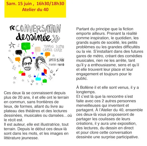 Samedi 15 juin de 16h30 à 18h30 : conversation dessinée Thomas Scotto et Carole Chaix à l'atelier du 40