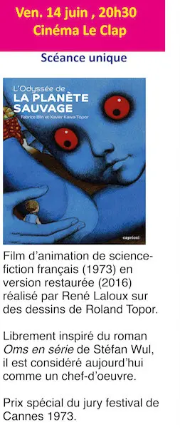 Cinéma d'animation : vendredi 14 juin à 20h30 au cinéma le Clap. L'Odyssée de la planète sauvage
