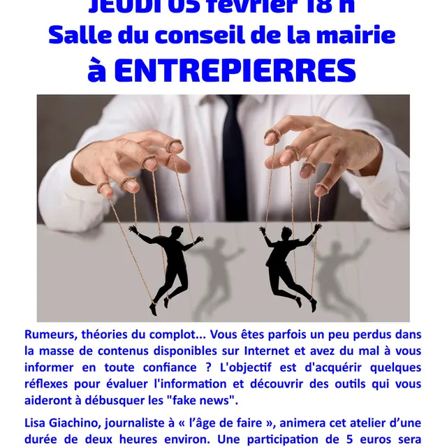 A l'heure où les moyens d’information et de désinformation se multiplient, où tout devient de plus en plus falsifiable, où il est de plus en plus difficile d’avoir des éléments crédibles de réflexion pour exercer notre citoyenneté de façon éclairée, l'association Trait d'union d'Entrepierres propose un nouvel atelier sur le thème de la désinformation.