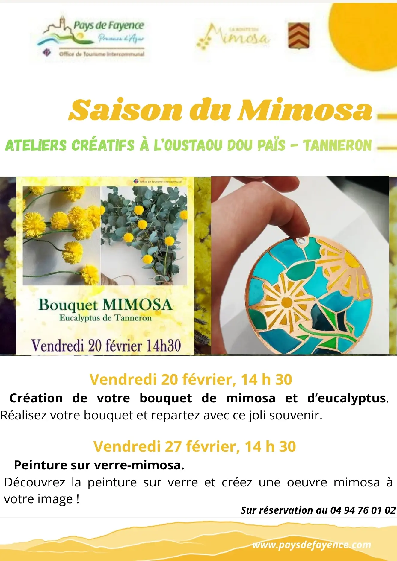 Tout au long de la saison du mimosa, l'Oustaou dou païs accueille des ateliers créatifs autour de la thématique du mimosa pour adultes et enfants (accompagnés de leurs parents) .
