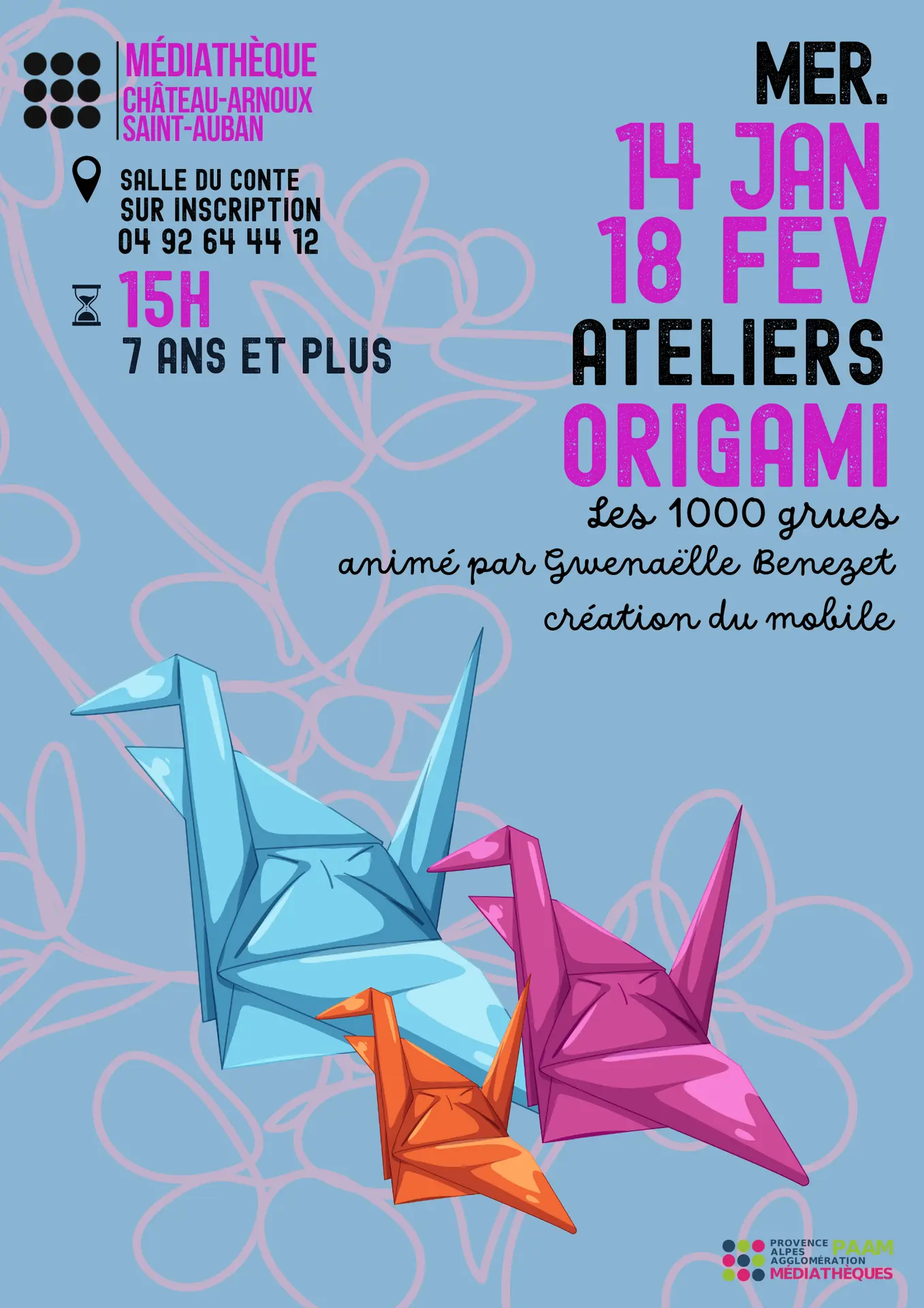 Ateliers Origami. Les 1000 grues, animé par Gwenaelle Benezet. Création du mobile. Sur inscription.